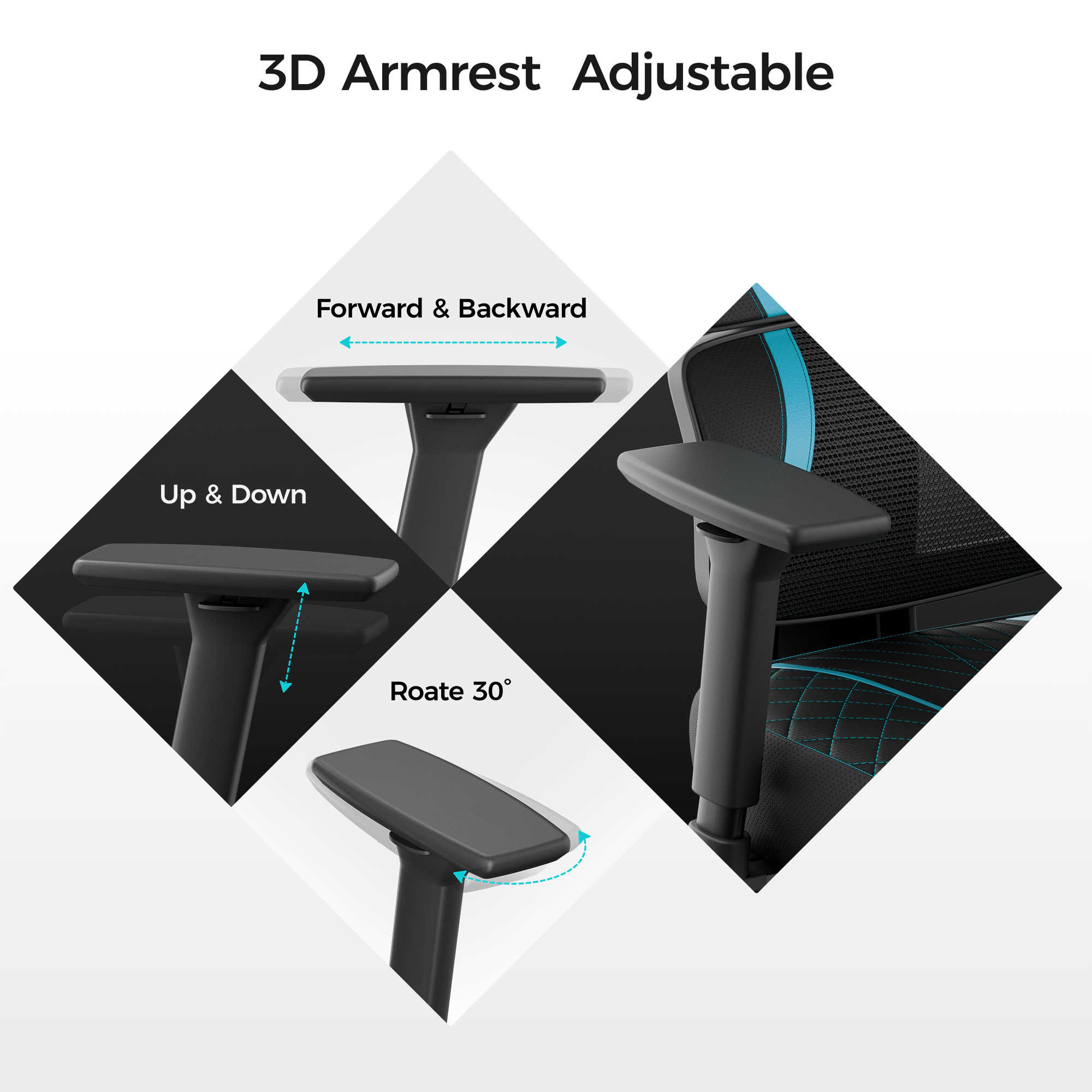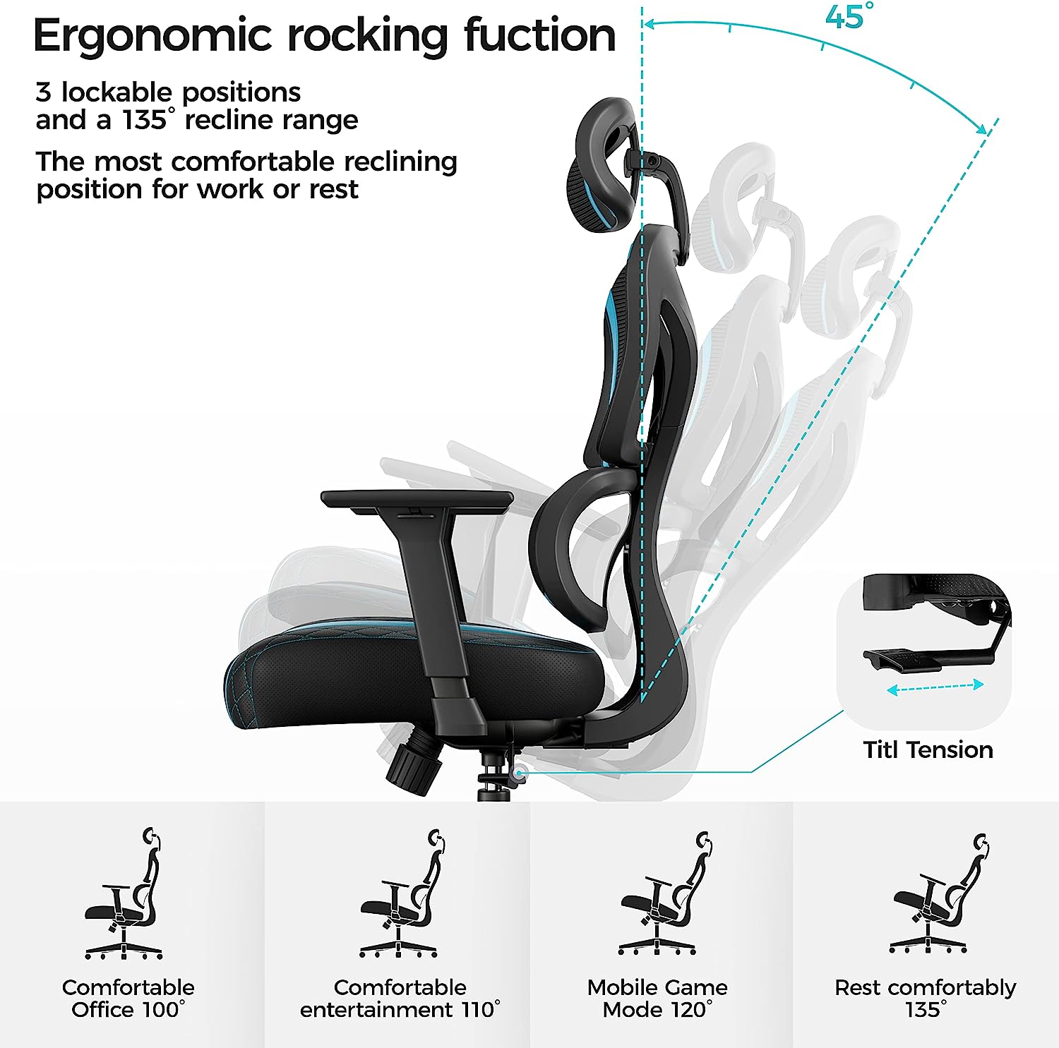 • Multiple Adjustment Options: 2D headrest, 3D armrest, 3 lockable positions, and a 135° recline range. Easily adjust to your most comfortable position for work or rest.