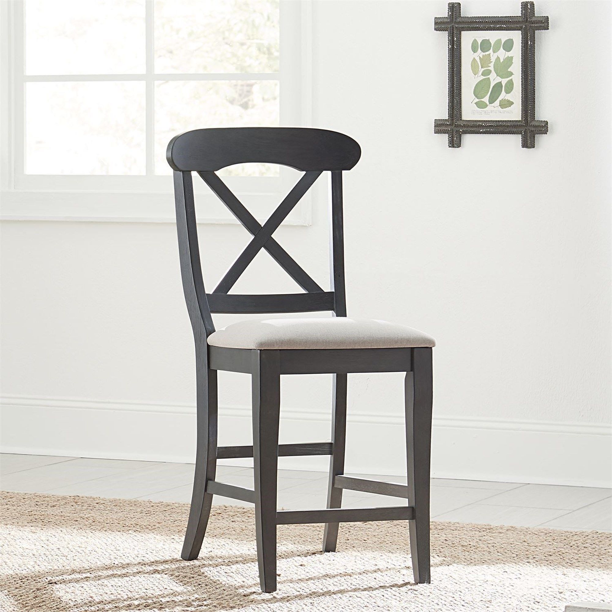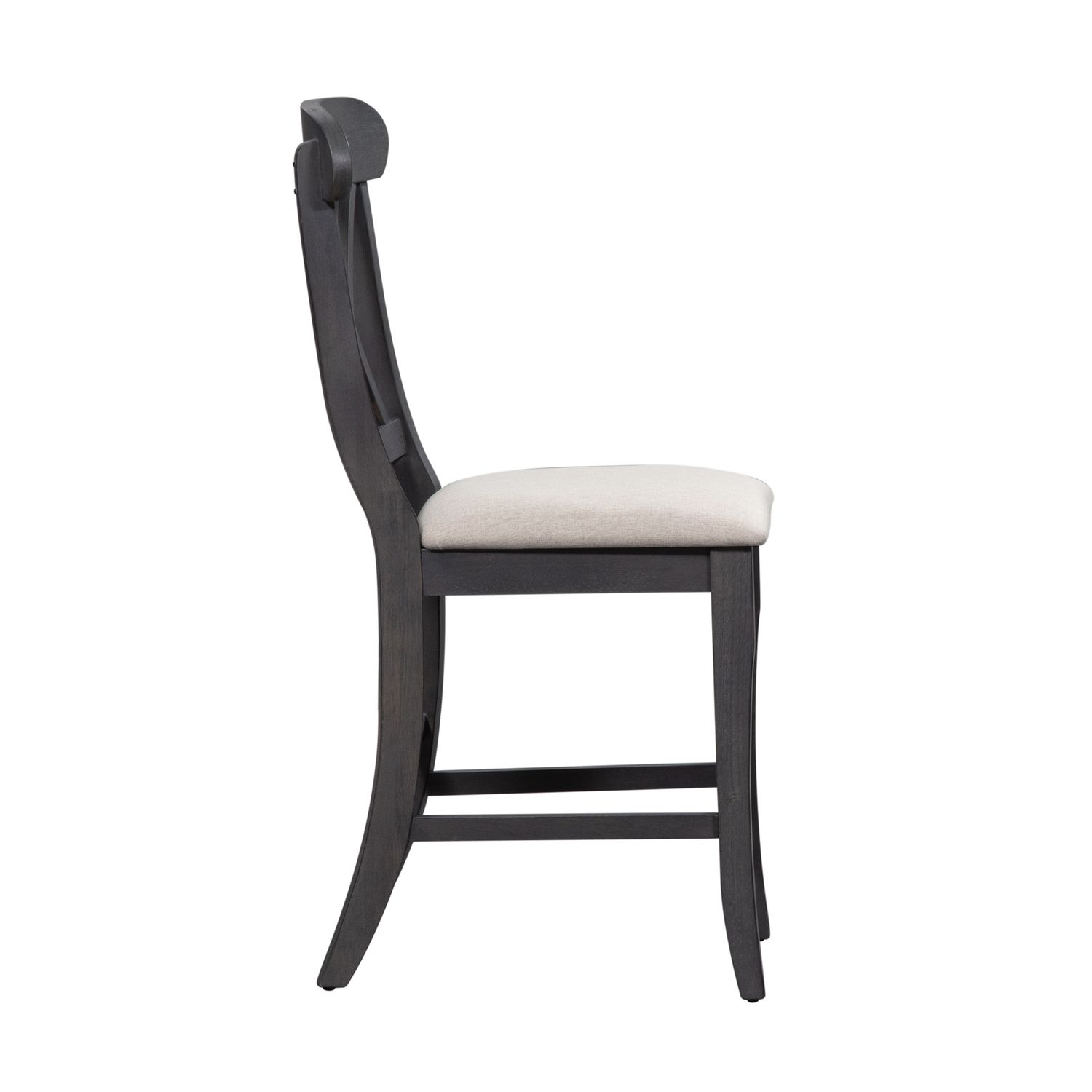 Sit in comfort and style with the Ocean Isle upholstered x back counter chair. Crafted of rubberwood solids, this piece features a slate finish, upholstery in grey linen, timeless napoleon styling, and is anchored by saber legs and nylon chair glides. This item comes in alternate finishes, sure to be a great addition to any home. Elegantly styled and casually proportioned, this chair works in a dining room or kitchen dining combination effortlessly.