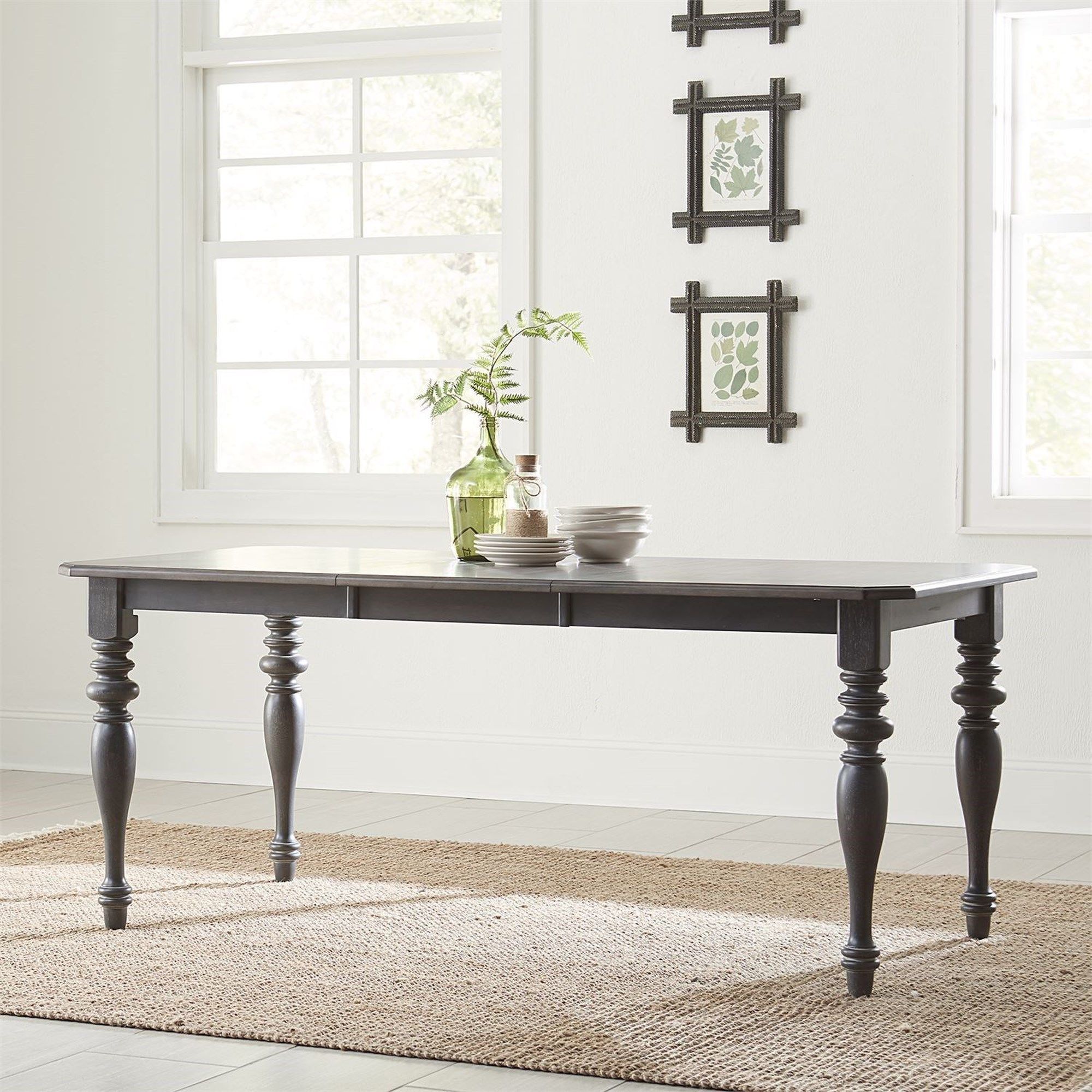 Gather around the Ocean Isle rectangular leg table. Crafted of rubberwood solids with pine veneers, this piece features a slate finish with weathered pine, one 18-inch removable leaf, canted corners, pine veneer top, a two-toned finish and is anchored by heavily turned legs. This piece is available in alternate finishes, sure to be a great addition to any home. Elegantly styled and casually proportioned, this table works in a dining room or kitchen dining combination effortlessly.