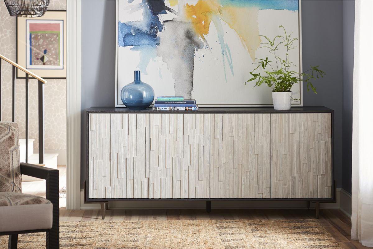 The Oslo Entertainment Console is crafted with a classic high contrast composition yet infused with a modern twist, featuring gorgeous texturized doors atop sleek tapered legs.