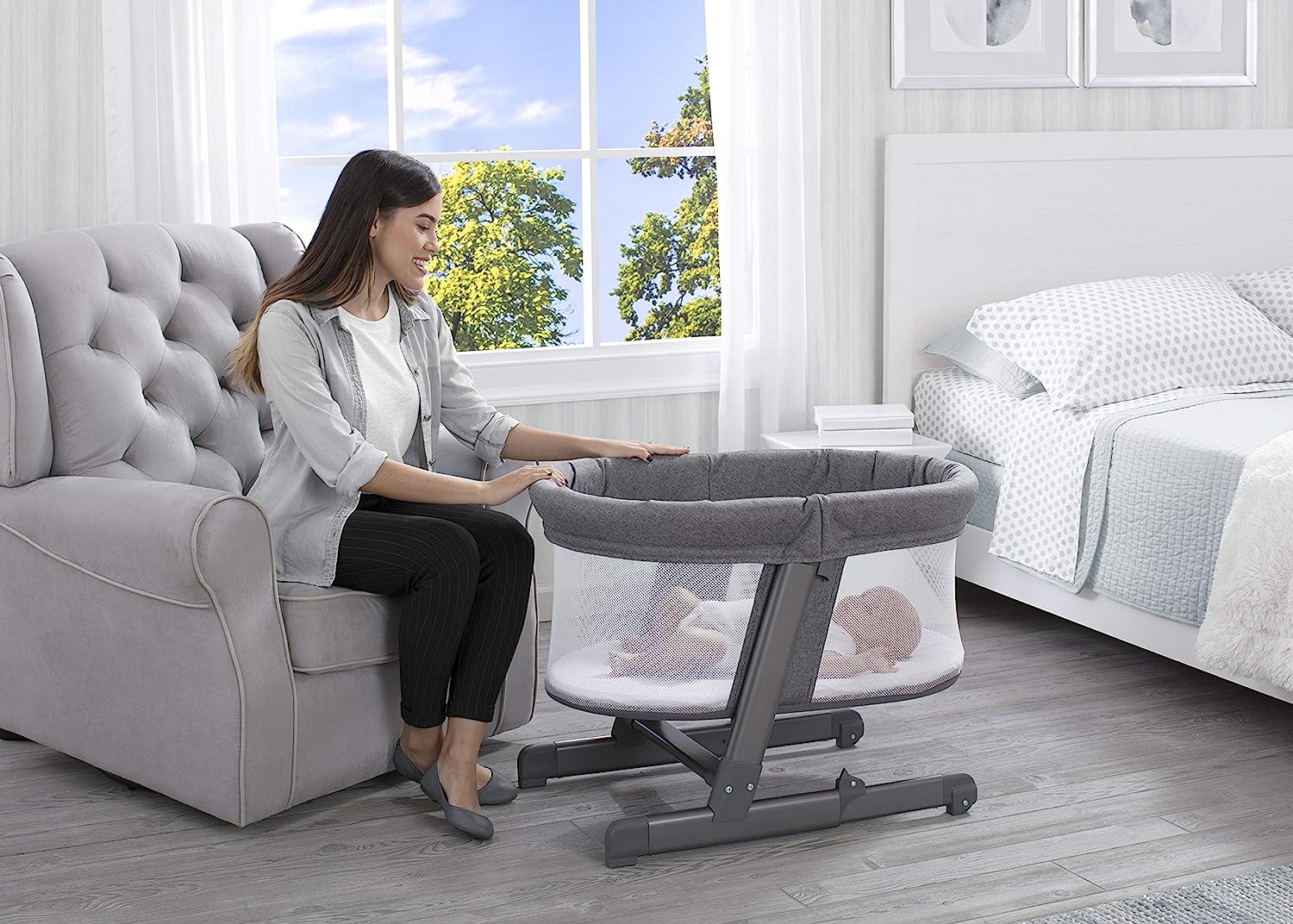 • Easy for babies and parents to share a room and is safer than co-sleeping