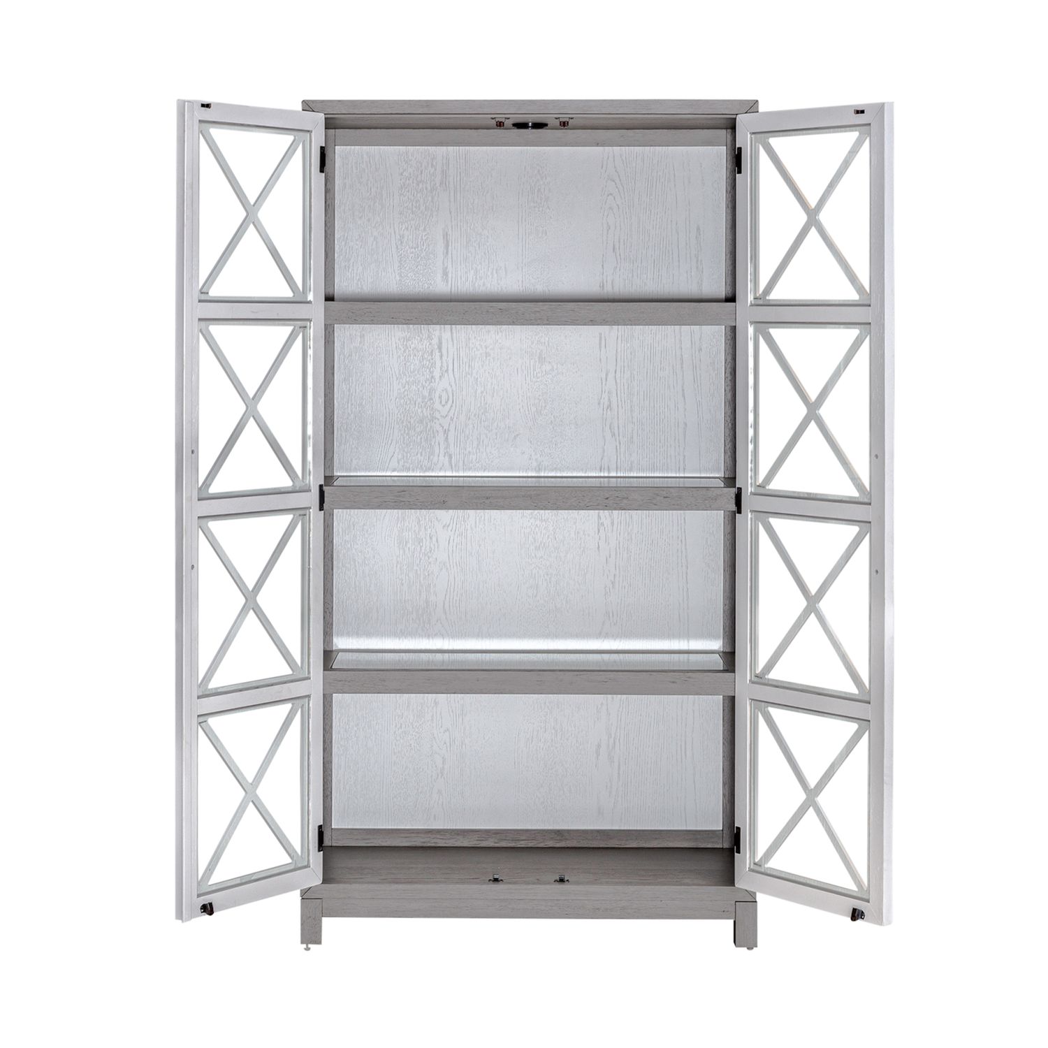 Home and perfection are achievable with the Palmetto Heights bunching display cabinet. Crafted with excellence using rubberwood solids and split heart cathedral white oak veneers, this display cabinet features a two-tone Driftwood and Shell White finish. Whether you want to escape to the good life, where every day is a vacation, or you want to bring a new level of sophistication to your home, Palmetto Heights offers a way to express your personality without sacrificing style. The bunching display cabinet features picture frame molding with two wood framed doors with X-style windowpane panels over tempered glass in a contemporary Driftwood and Shell White two-tone finish. Behind the doors are three adjustable shelves and one fixed shelf that is illuminated by touch LED lighting. The block foot base adds a contemporary element to the clean lines of the display cabinet. Purchase multiple display cabinets and bunch them together for an impressive wall of display. The Palmetto Heights bunching display cabinet offers a unique point of view that is sure to inspire.