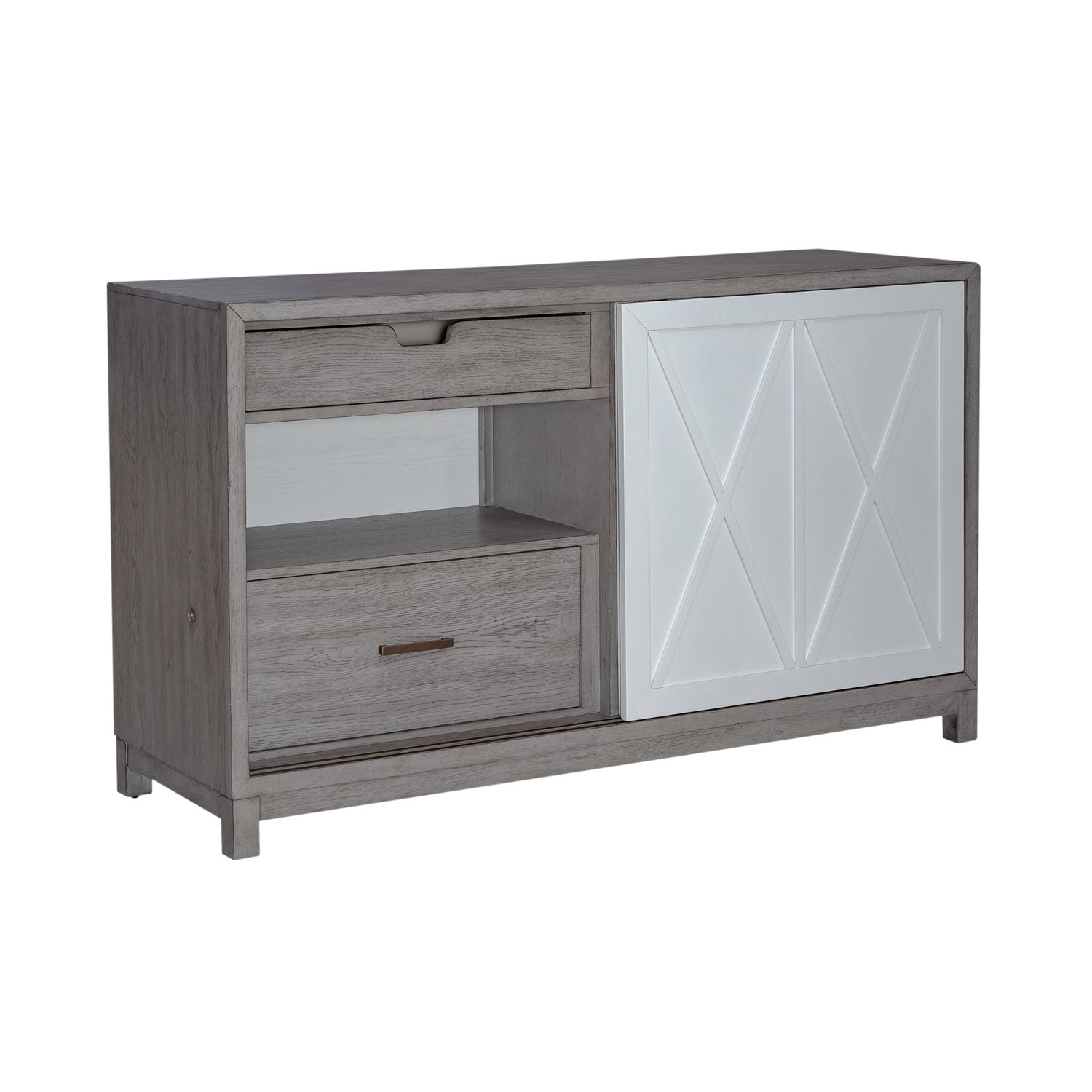 Home and perfection are achievable with the Palmetto Heights server. Crafted with excellence using rubberwood solids and split heart cathedral white oak veneers, this server features a two-tone Driftwood and Shell White finish. Whether you want to escape to the good life, where every day is a vacation, or you want to bring a new level of sophistication to your home, Palmetto Heights offers a way to express your personality without sacrificing style. This server features picture frame molding and two wood framed sliding doors with X-style panel overlays creating the illusion of four doors. The block foot base adds a contemporary element to the clean lines of the server. Behind the doors are two premium felt lined top drawers, one adjustable shelf and one fixed shelf, and a locking storage drawer. Work from home and let the Palmetto Heights server become multi-purposeful and double as your credenza. The Palmetto Heights server offers a unique point of view that is sure to inspire.