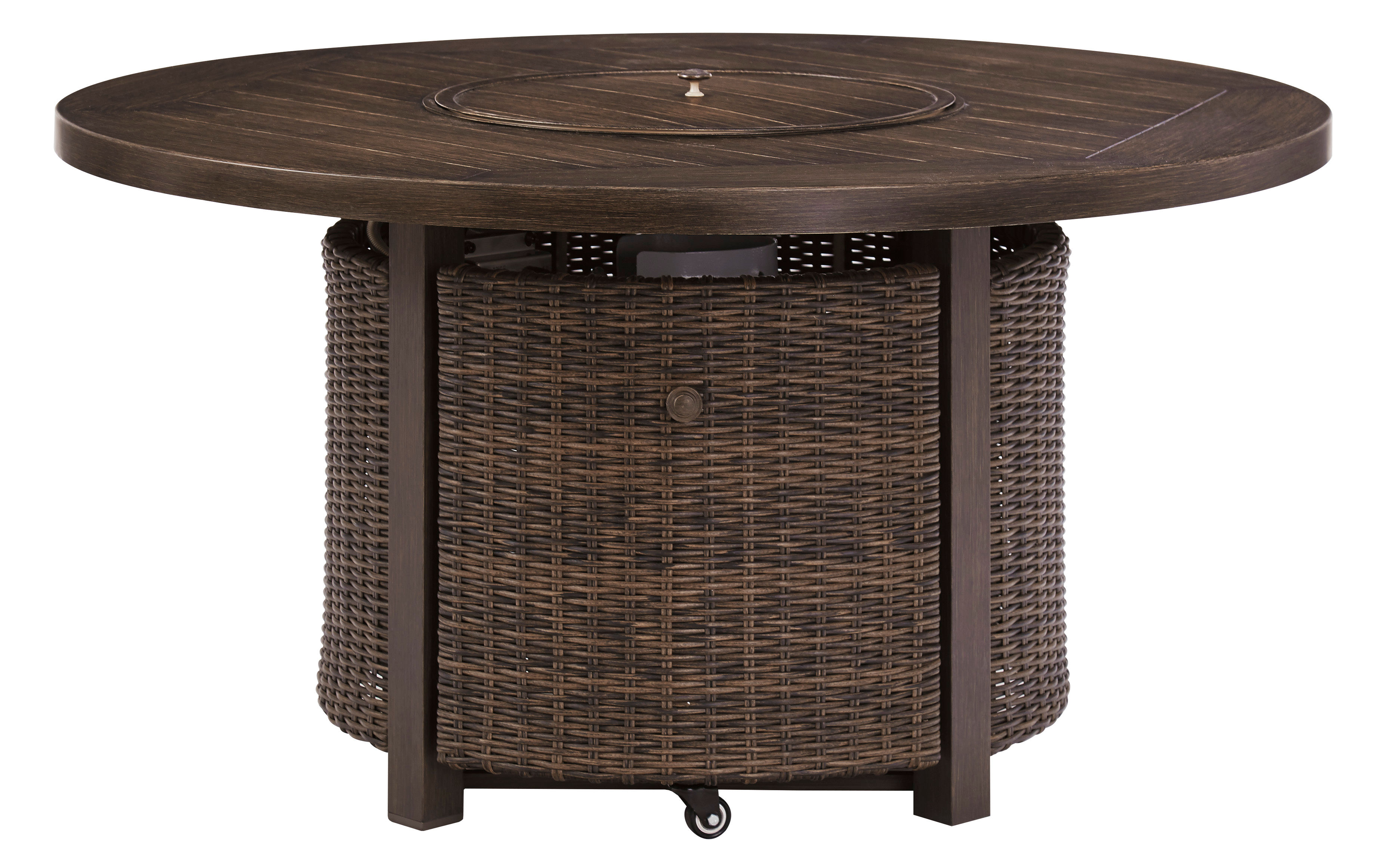 Turn your backyard space into your own piece of paradise with the Paradise Trail outdoor fire pit table. Though this outdoor table looks remarkably like wood, it’s made of sturdy, rust-proof aluminum that’s perfectly suited for al fresco living. Enhancing the rustically refined aesthetic: side panels accented with all-weather, handwoven resin wicker. The result may look high maintenance, but rest assured, this outdoor piece is anything but. With the press of a button, ignite a flickering flame that dances over a bed of glass beads. And with room for four, it’s one highly accommodating outdoor fire pit table.