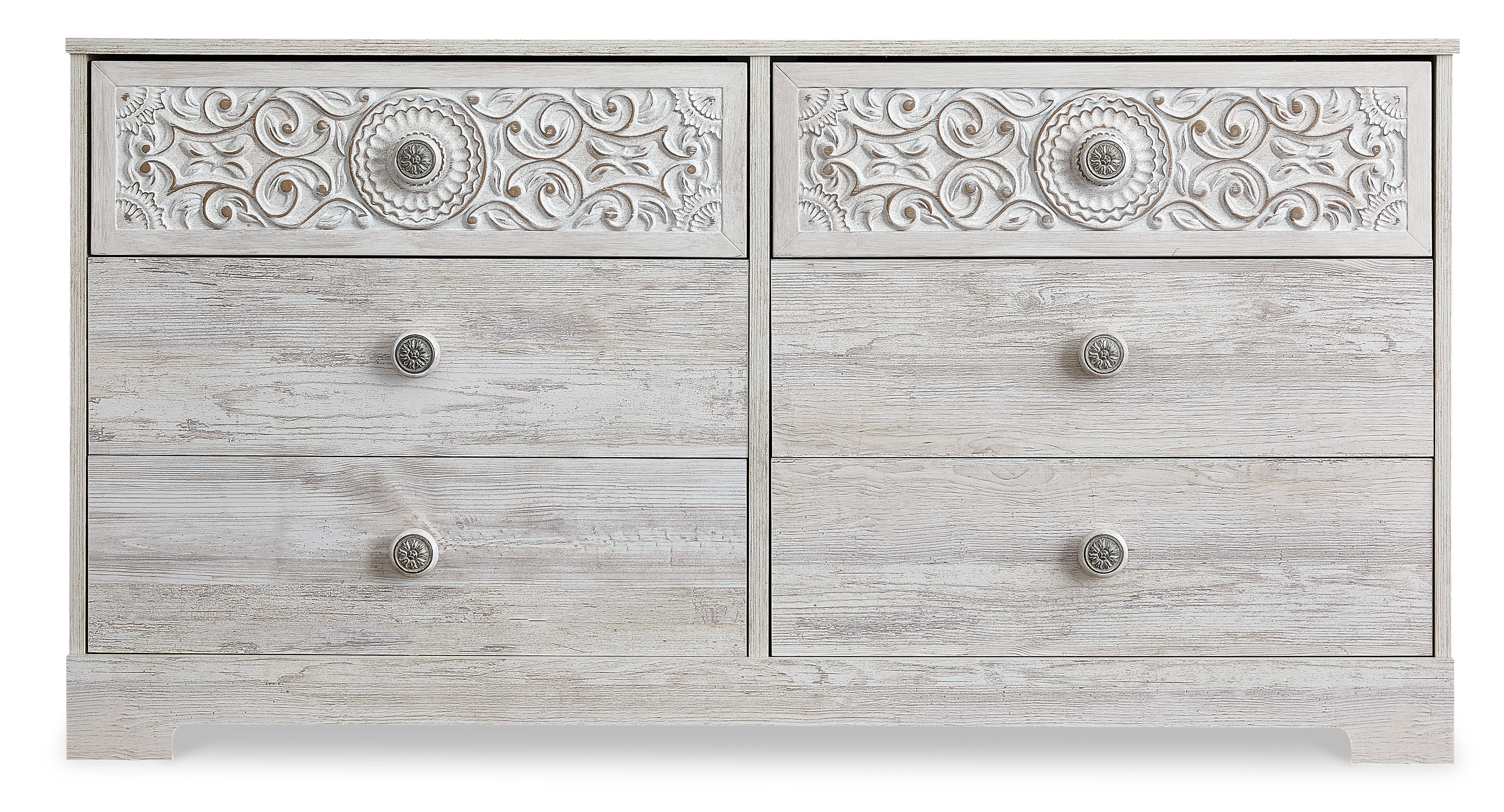 If it's coastal chic or cottage quaint style you long for, the Paxberry whitewashed dresser invites you to go to town. Its distinctive weatherworn finish conveys an easy-breezy sensibility, perfect for a restful bedroom retreat. Tastefully edited lines and medallion drawer pulls give this attractively priced dresser a high-end aesthetic.
