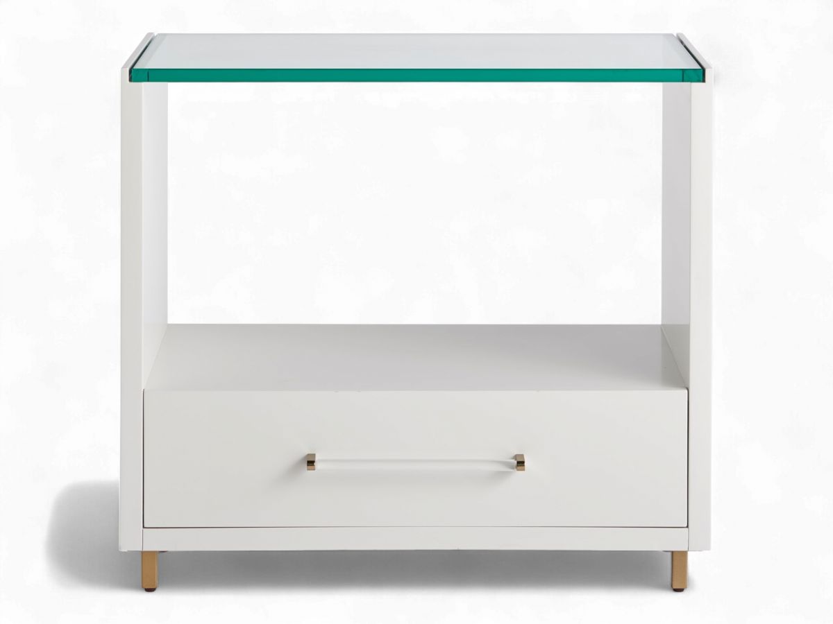 A charming juxtaposition of materials, the Peony Nightstand finds seamless balance between a glass top, champagne and acrylic bar hardware and a chic White Lacquer finish. For added flair, the legs are finished in soft gold.