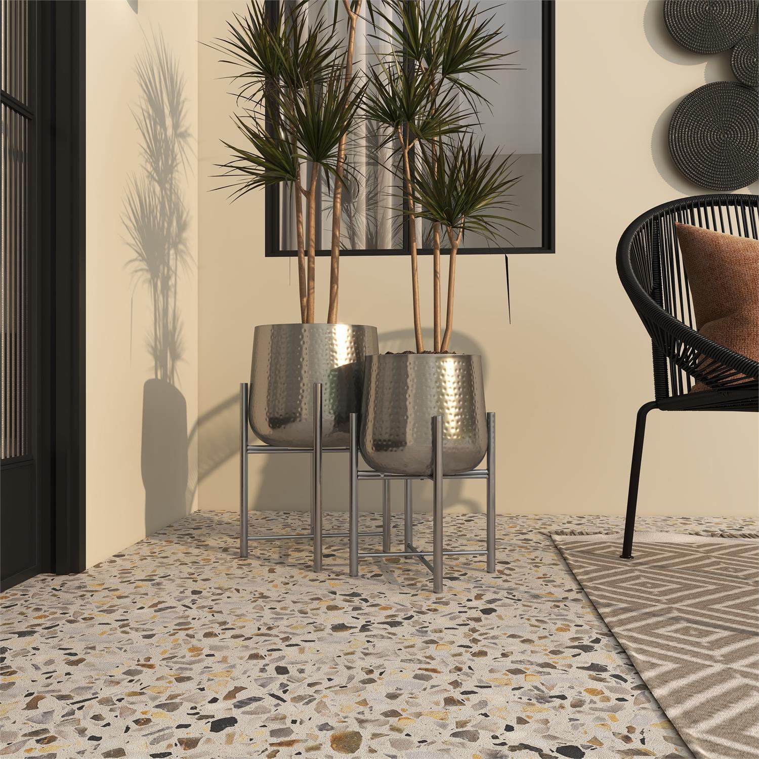 • Satin silver flower pots for outdoor plants feature a round shape and hammered details that offer a pleasing contrast to the angular lines of the stands, creating a harmonious balance between softness and structure