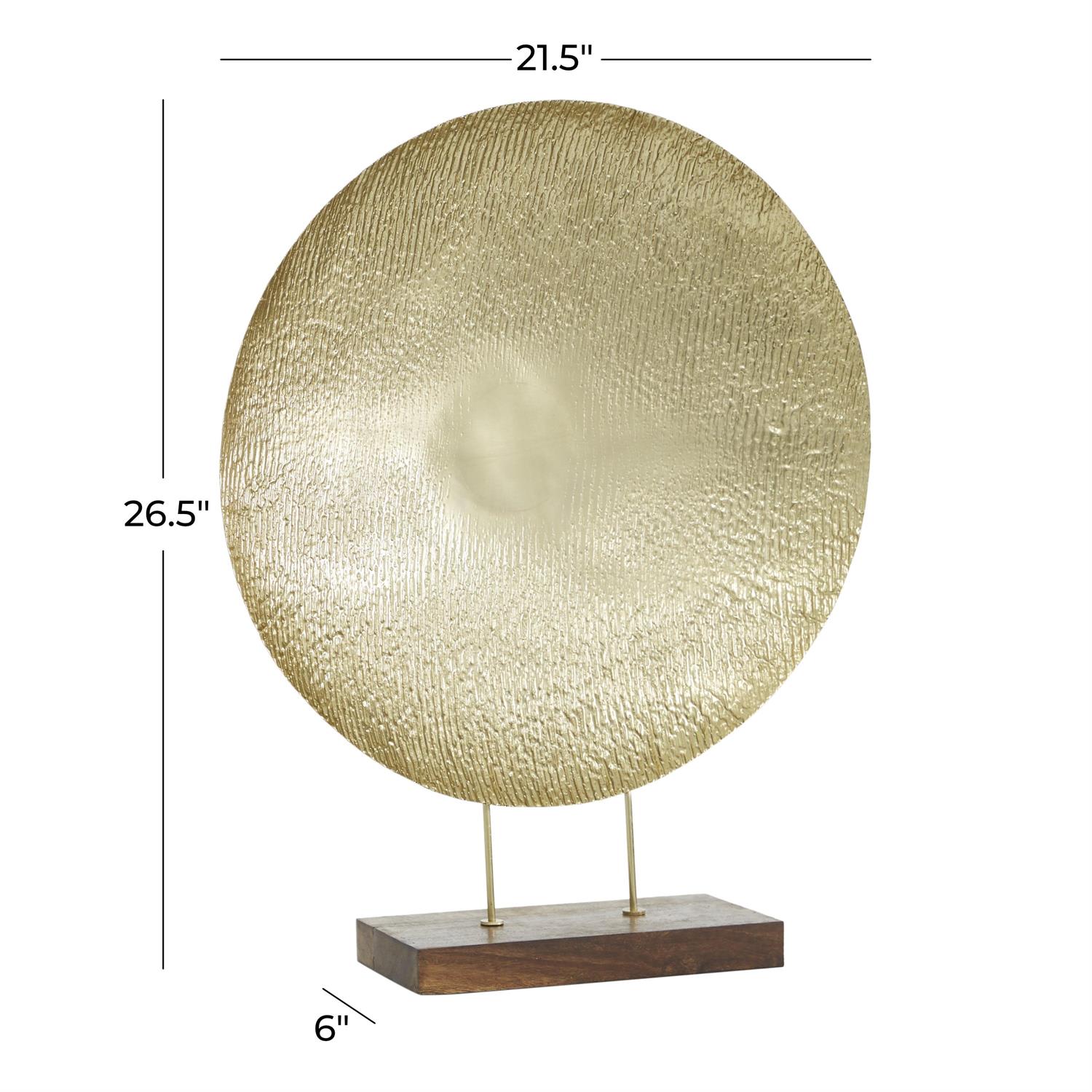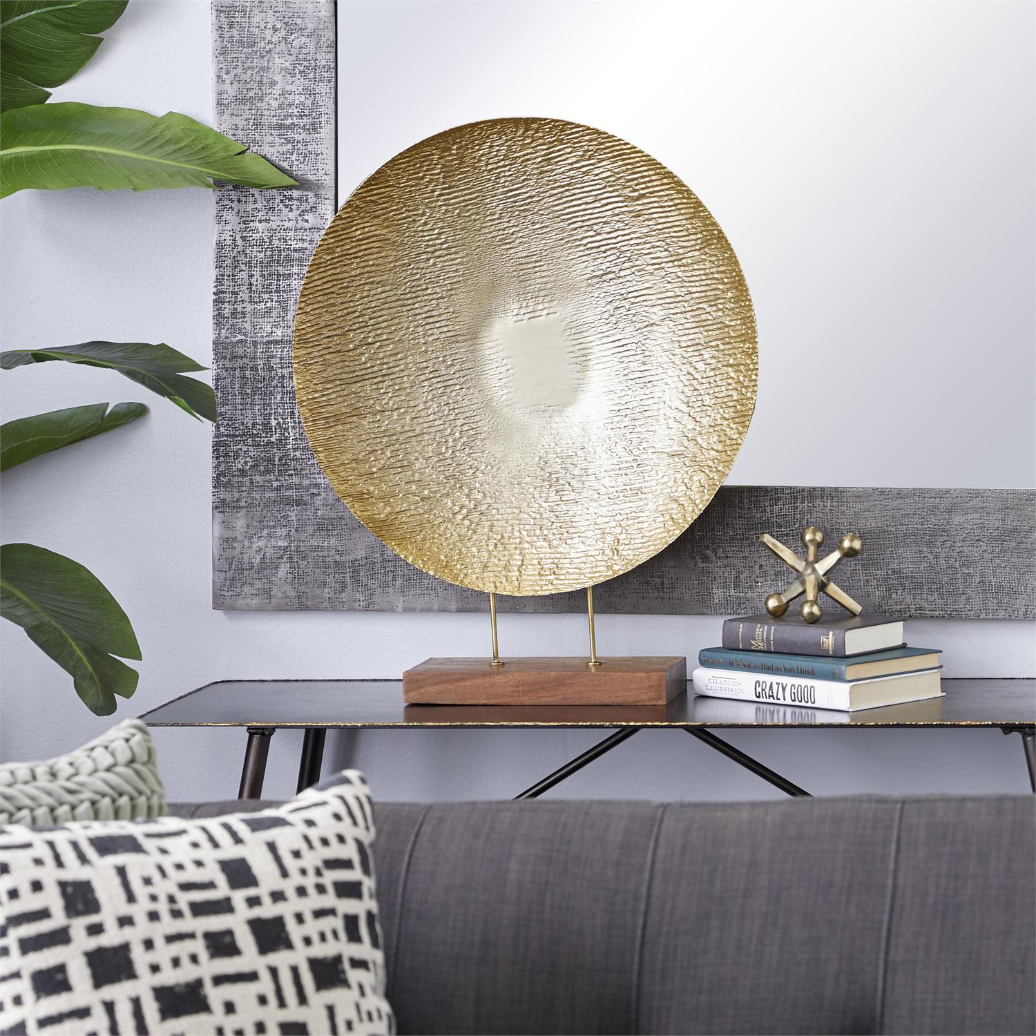 Embrace artistic expression with a style that highlights bold designs with sleek lines, neutral elements, and a minimalist aesthetic. Gold decorative sculpture is crafted from durable metal and wood, skillfully combining the intricacies of craftsmanship. Round decorative statue boasts a satin gold finish with a brown wood base that creates a visually striking piece. Iron sculpture features a unique round concave form with a captivating reflective effect.