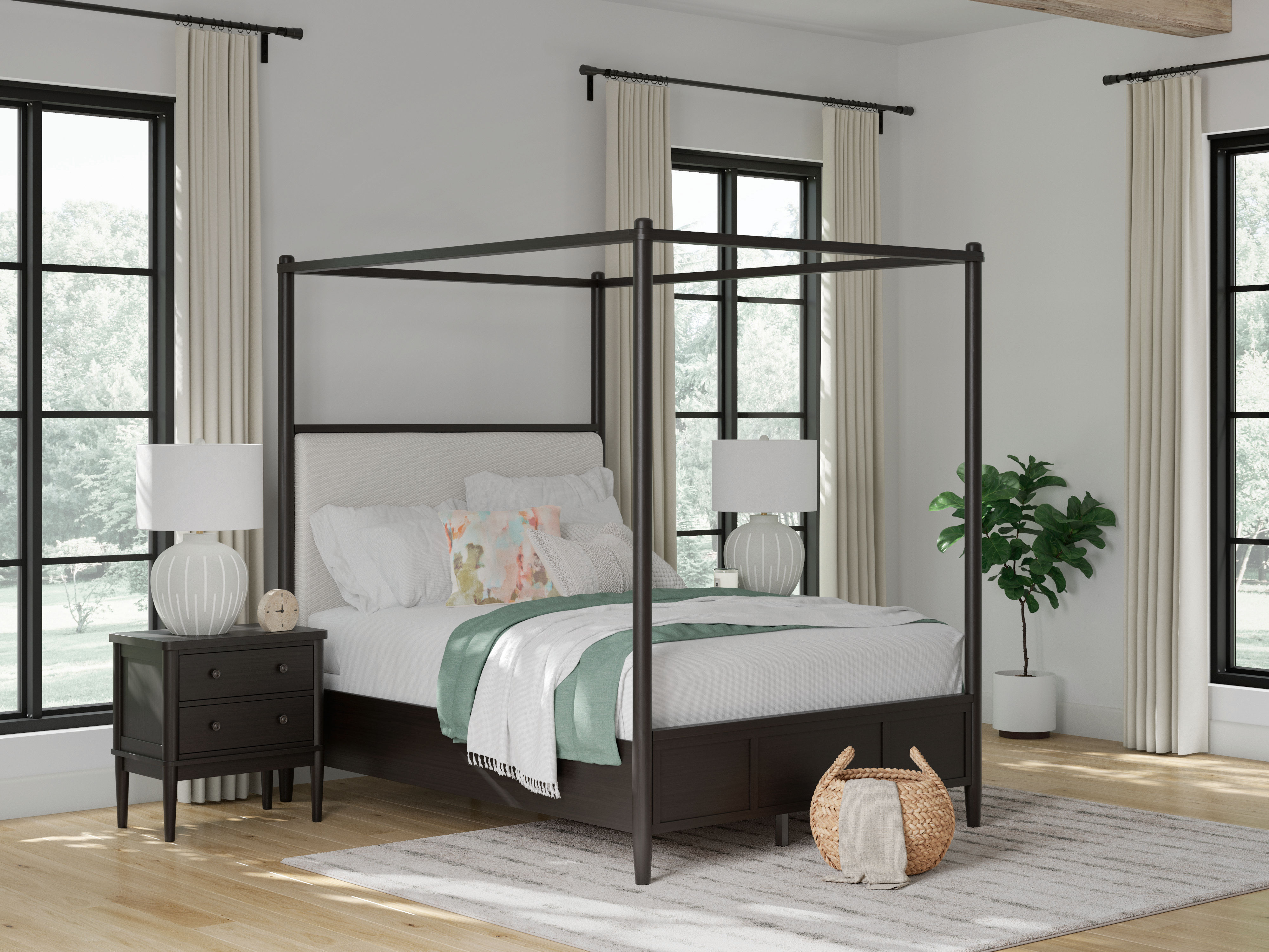 Farmhouse and contemporary design, balanced beautifully. This queen upholstered canopy bed merges simple aesthetics and round posts for an updated sensibility. Its cushioned headboard sports Next-Gen Nuvella™ performance fabric that's easy to clean. A modern French black finish with deep warm brown undertones perfectly punctuates this casually inviting bed.