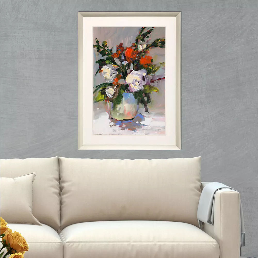 A still life of roses is matted in white. Framed in a modern warm silver finish moulding.