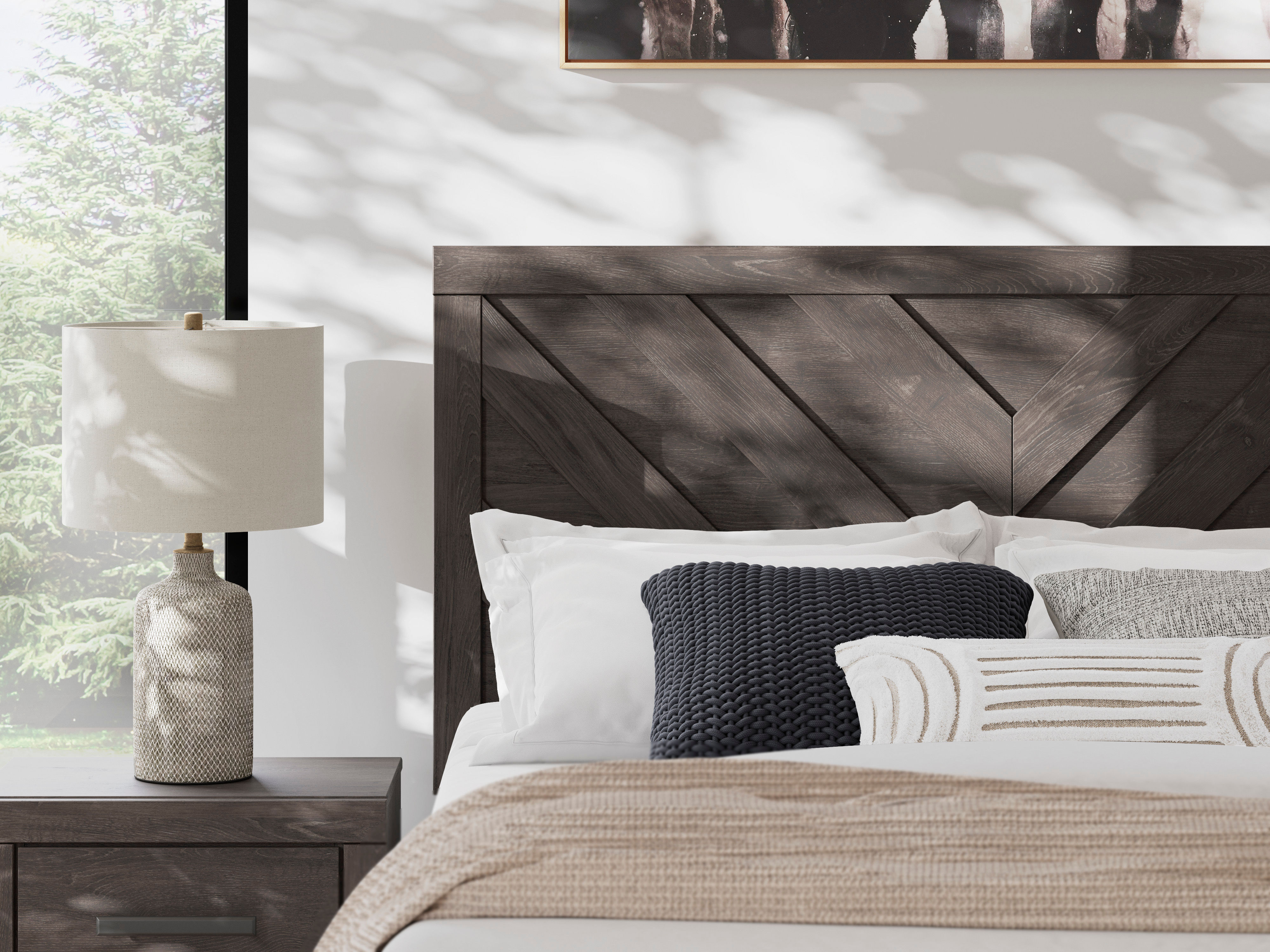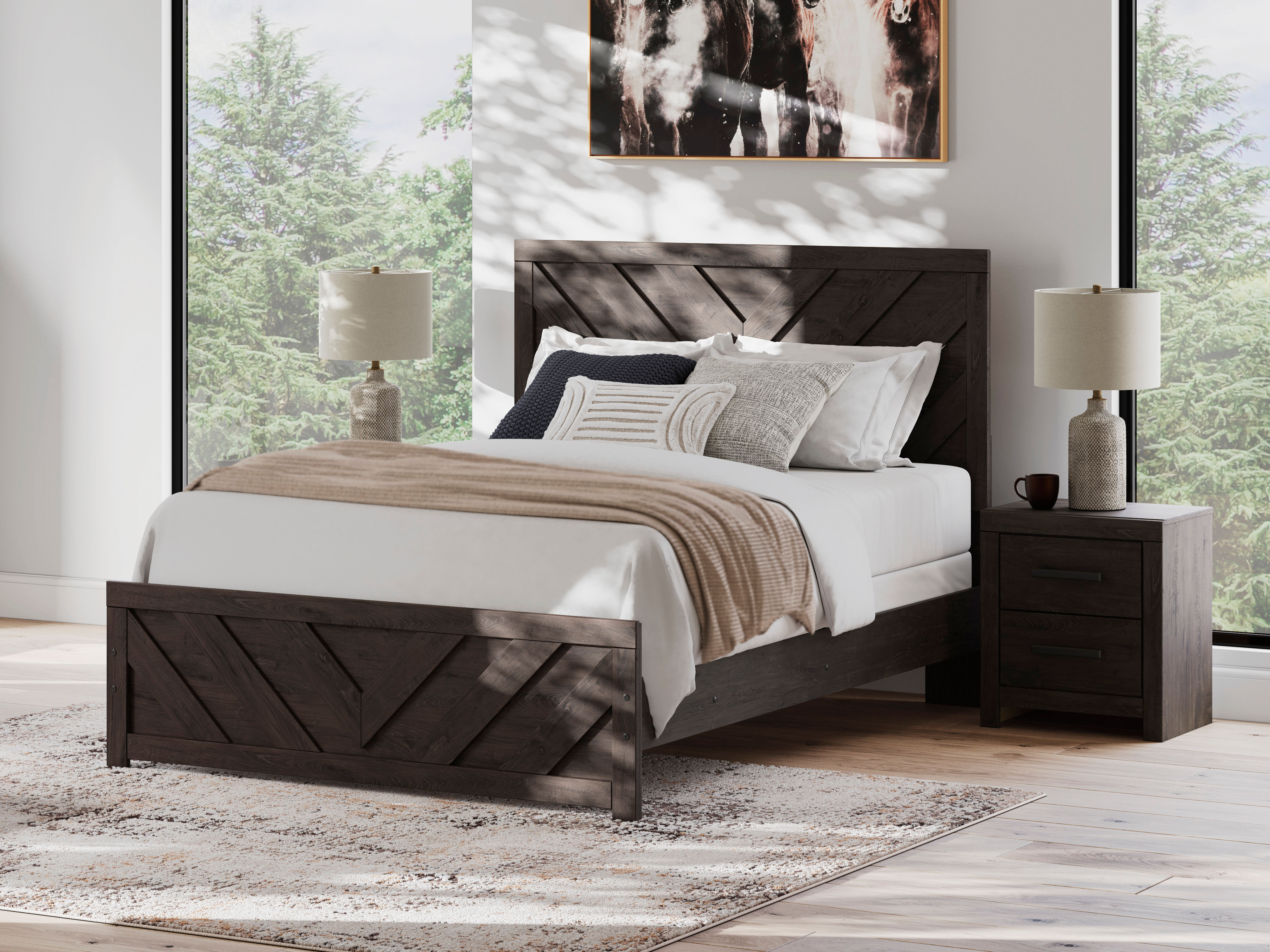 Embrace the casual contemporary style of the Prendonea queen panel bed. The dark charcoal finish with a chevron design on the headboard and footboard makes this piece visually interesting for any type of bedroom you have.