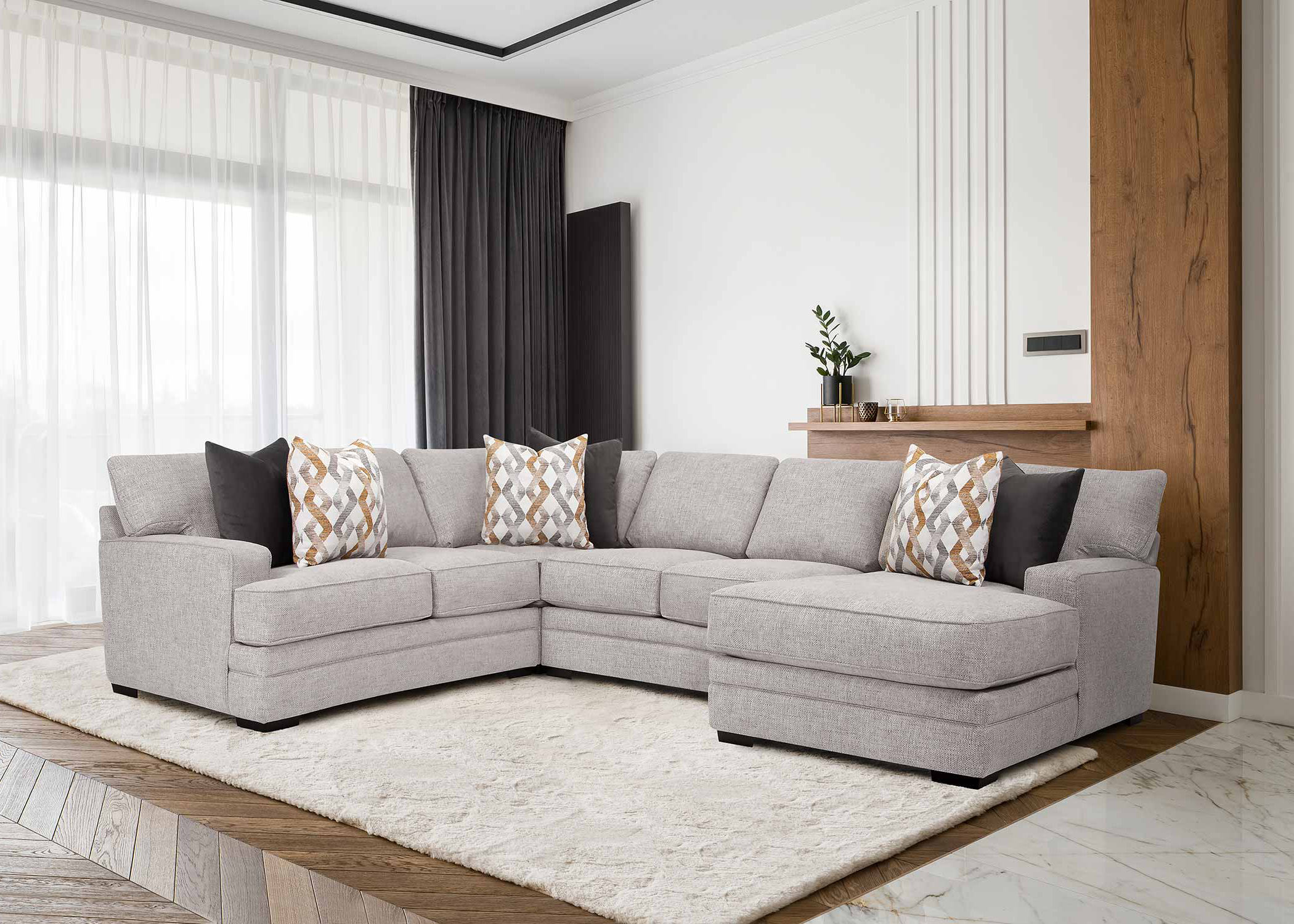 This sectional has a versatile style with neutral coloration, graphic accent pillows, deep seating, and durable cover.