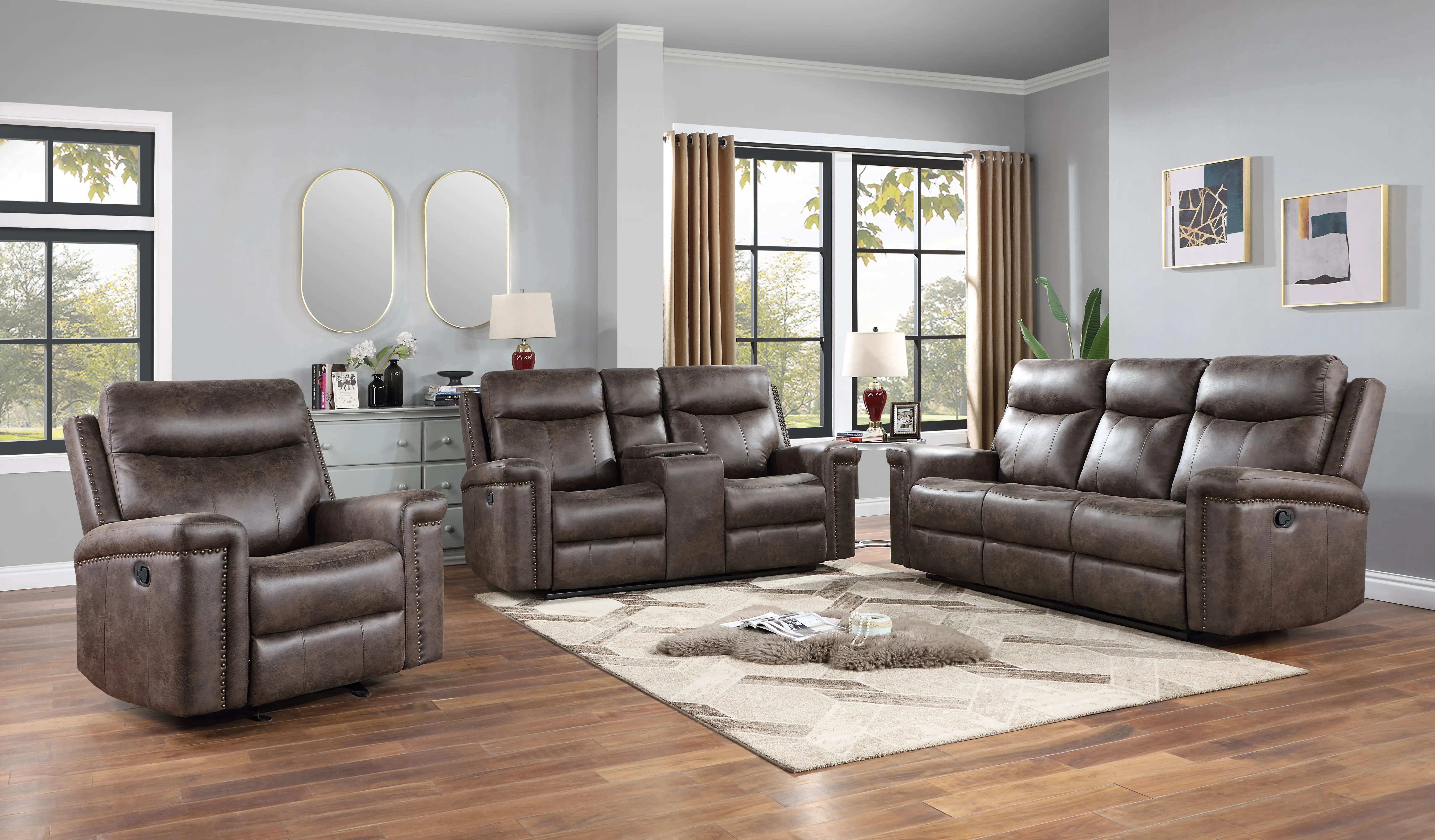 The comfort and style of the Quade reclining loveseat will bring a traditional aesthetic to your living room. Made with faux leather in a mocha brown finish, this reclining loveseat has the look of leather but the feel of fabric. This piece has a pull-tab reclining release that makes it easy to relax and wind down for the day with cupholders and a console with storage for keeping everything you need within arms reach.