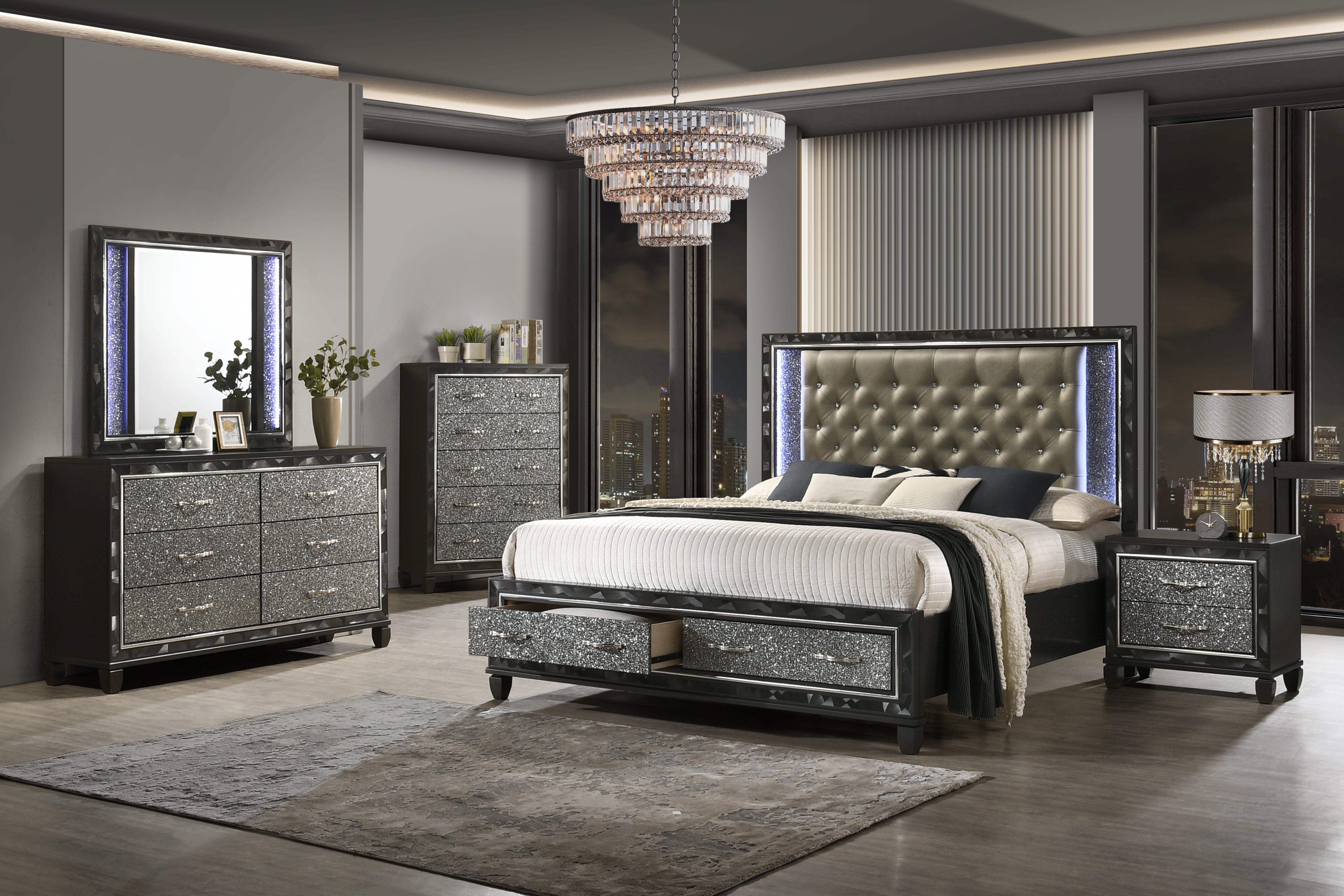 • Glamorous Details: Glossy black textured black inlays, mylar trim and a crushed crystal look decorative laminates are used throughout the collection to create and eye-catching, opulent appeal.