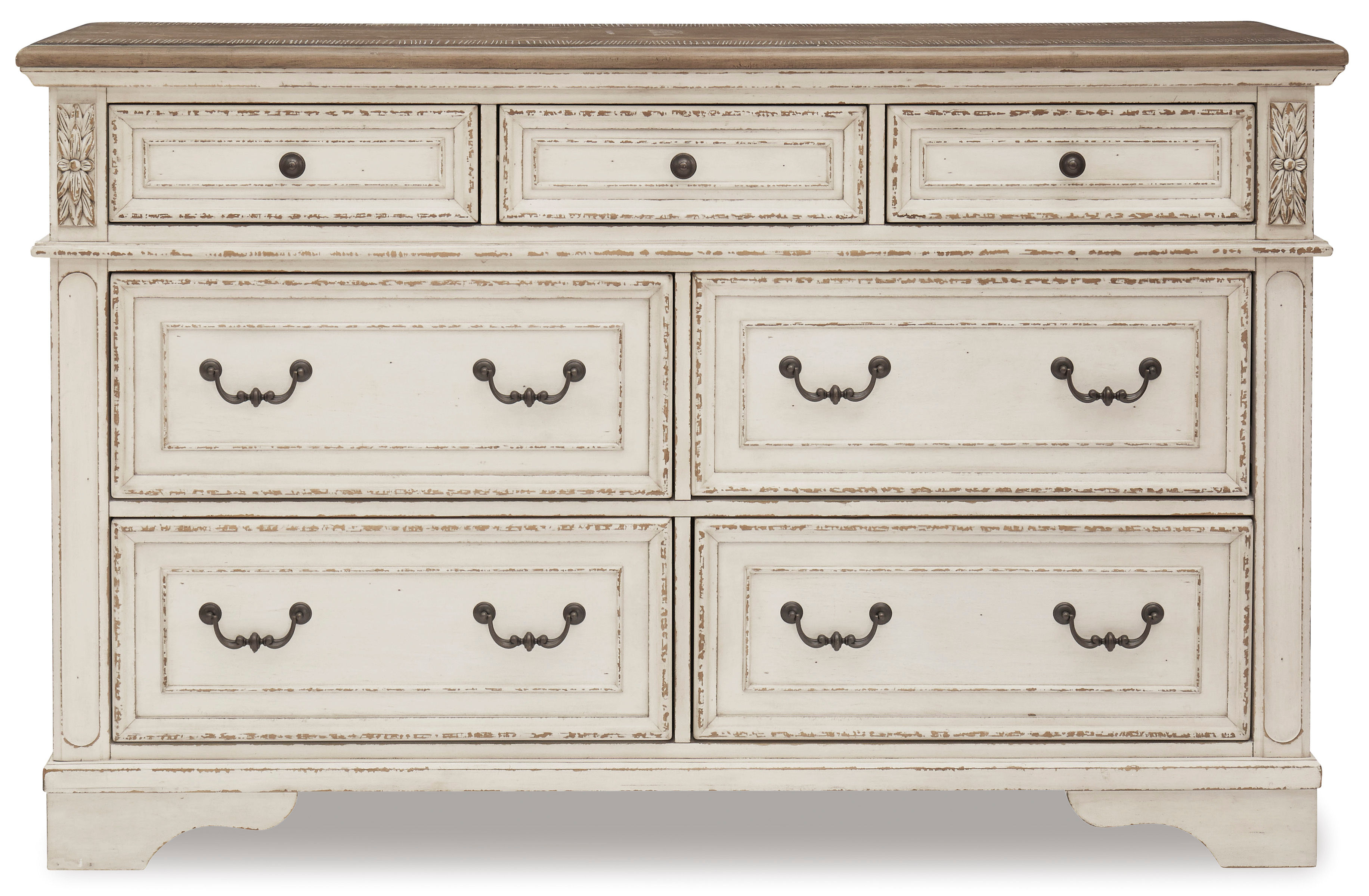 Elevating the art of traditional cottage styling, the Realyn dresser is your dream bedroom retreat realized. Its antiqued two-tone aesthetic blends a chipped white with a distressed wood finished top for added charm. Framed drawer fronts and decorative corbels add refinement, while bail pulls in a dark bronze-tone finish lend a classic touch.