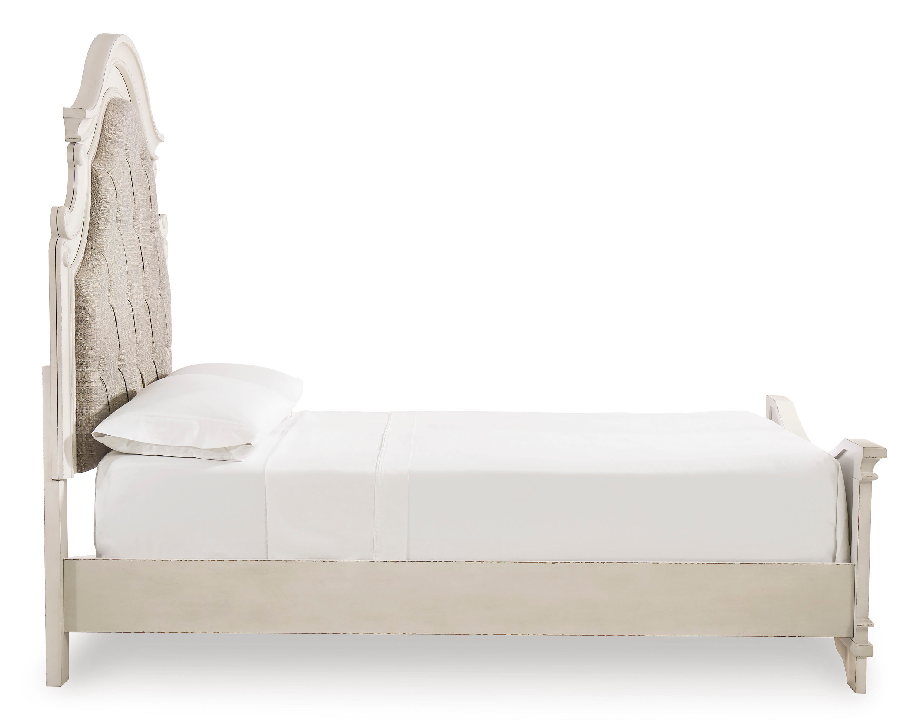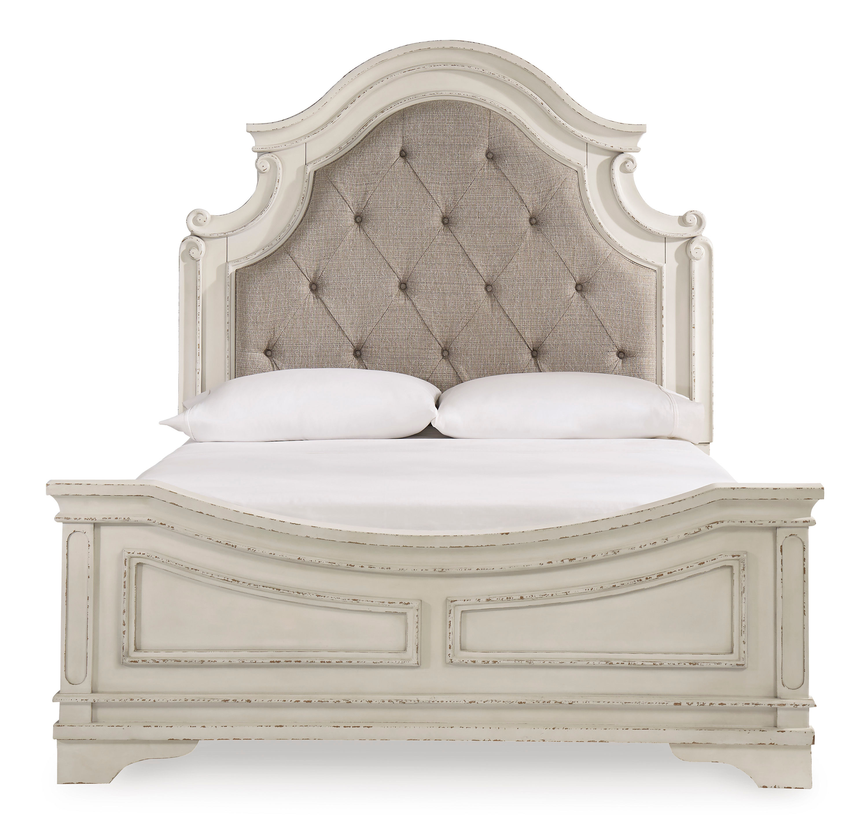 Elevating the art of traditional cottage styling, the Realyn queen upholstered bed is your dream bedroom retreat realized. A curvaceous beauty, this brilliant upholstered bed wows with dramatic scalloped details and fanciful trim work. The distressed chipped white finish charms with its heirloom appeal. Deep tufting on the cushioned upholstered headboard adds such a cozy element sure to put you at ease. Mattress and foundation/box spring available, sold separately.