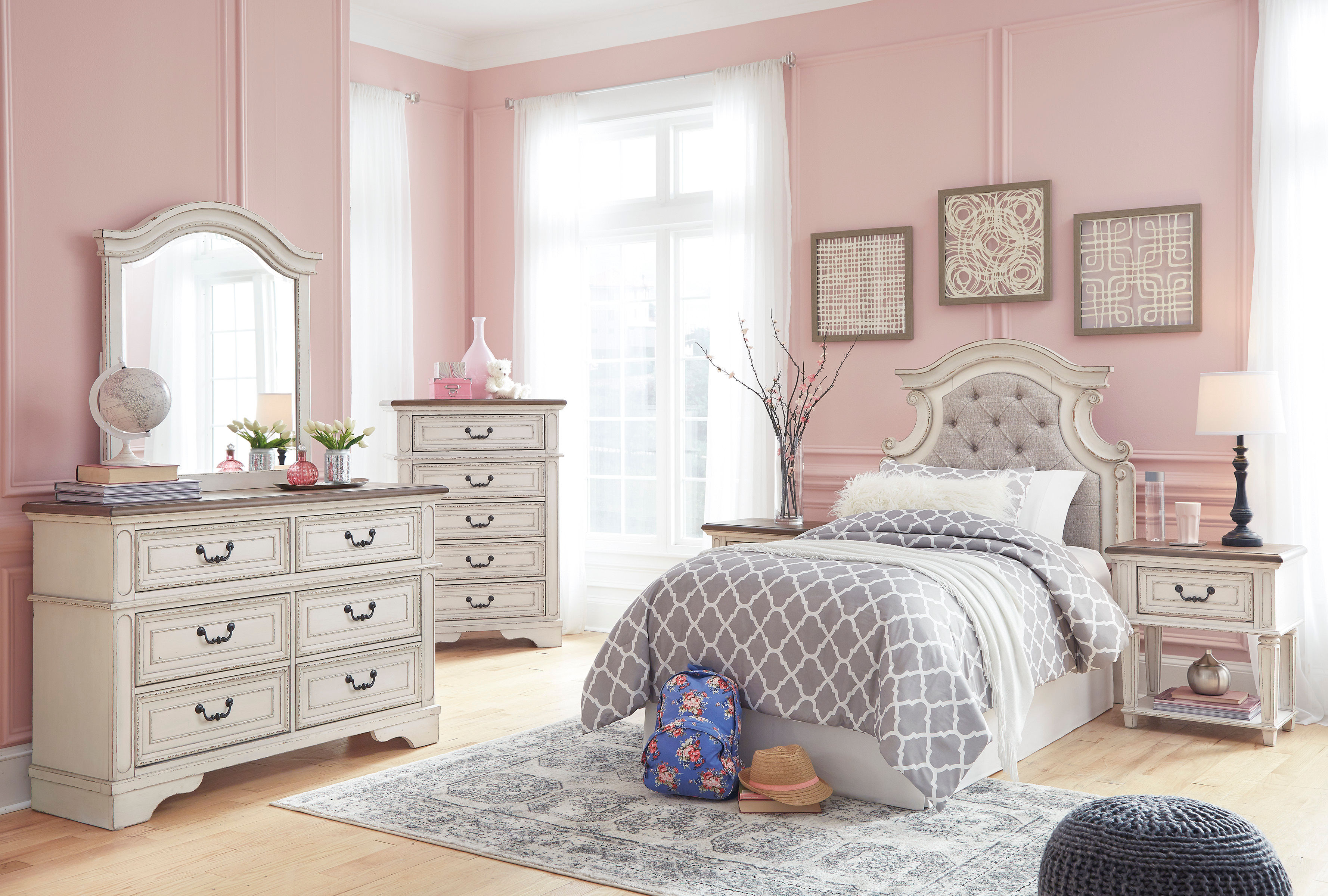 Redefining the art of traditional cottage styling, the Realyn twin upholstered panel headboard is your dream bedroom retreat realized. The ornately shaped headboard with inset upholstered cushion brings cozy charm. Button tufting adds refinement, while a chipped white finish lends a classic touch.