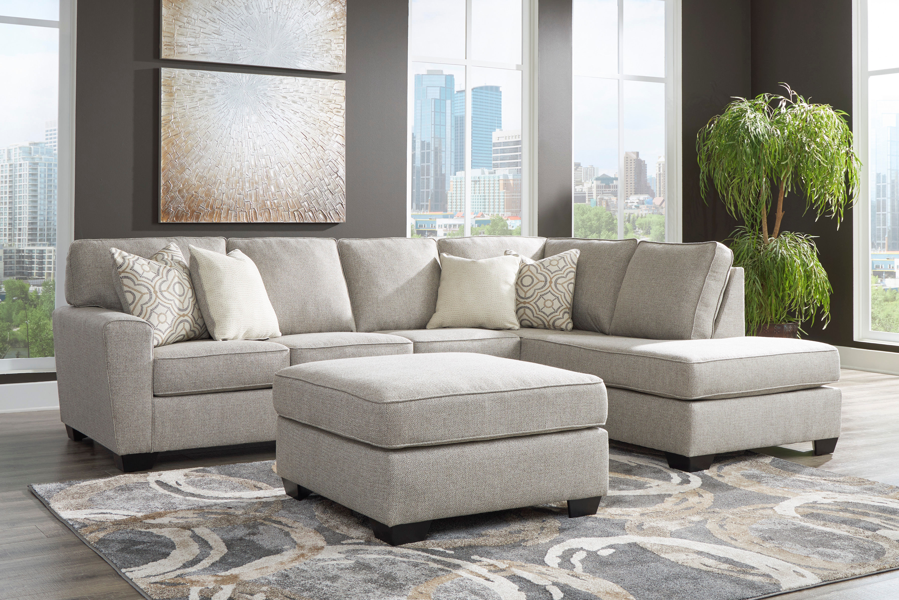 A clean-lined design with modern comfort, the Reydell sectional in a gray-beige fabric upholstery will elevate your living room to the next level. Made to be both comfortable and stylish, this sectional has plush cushioning wrapped in soft fabric and throw pillows that add visual interest with their designs and colors. While the Reydell sectional features contemporary style and the ultimate comfort, it was also made to be durable. The platform foundation and sturdy metal frame means this piece will last for years to come.
