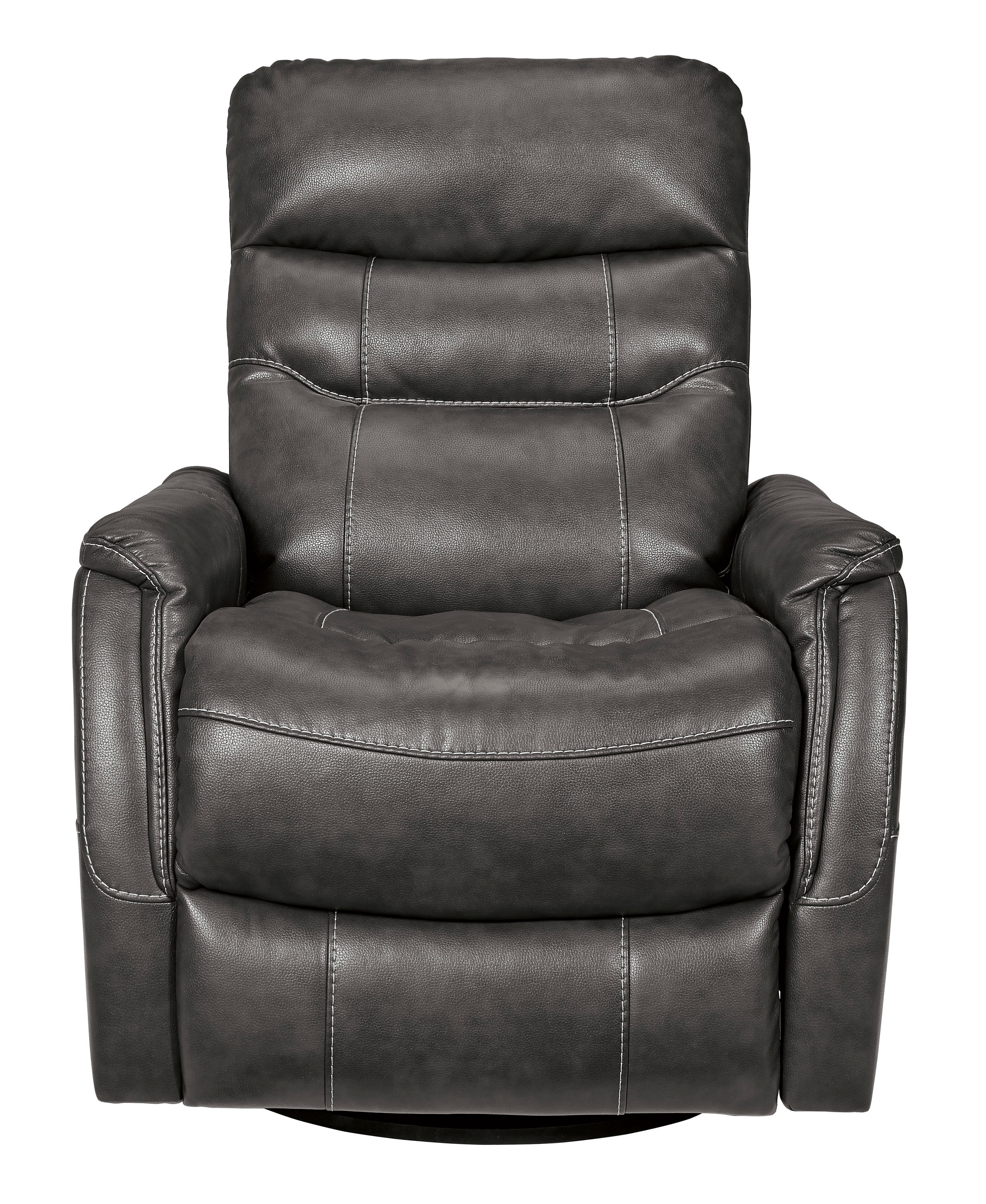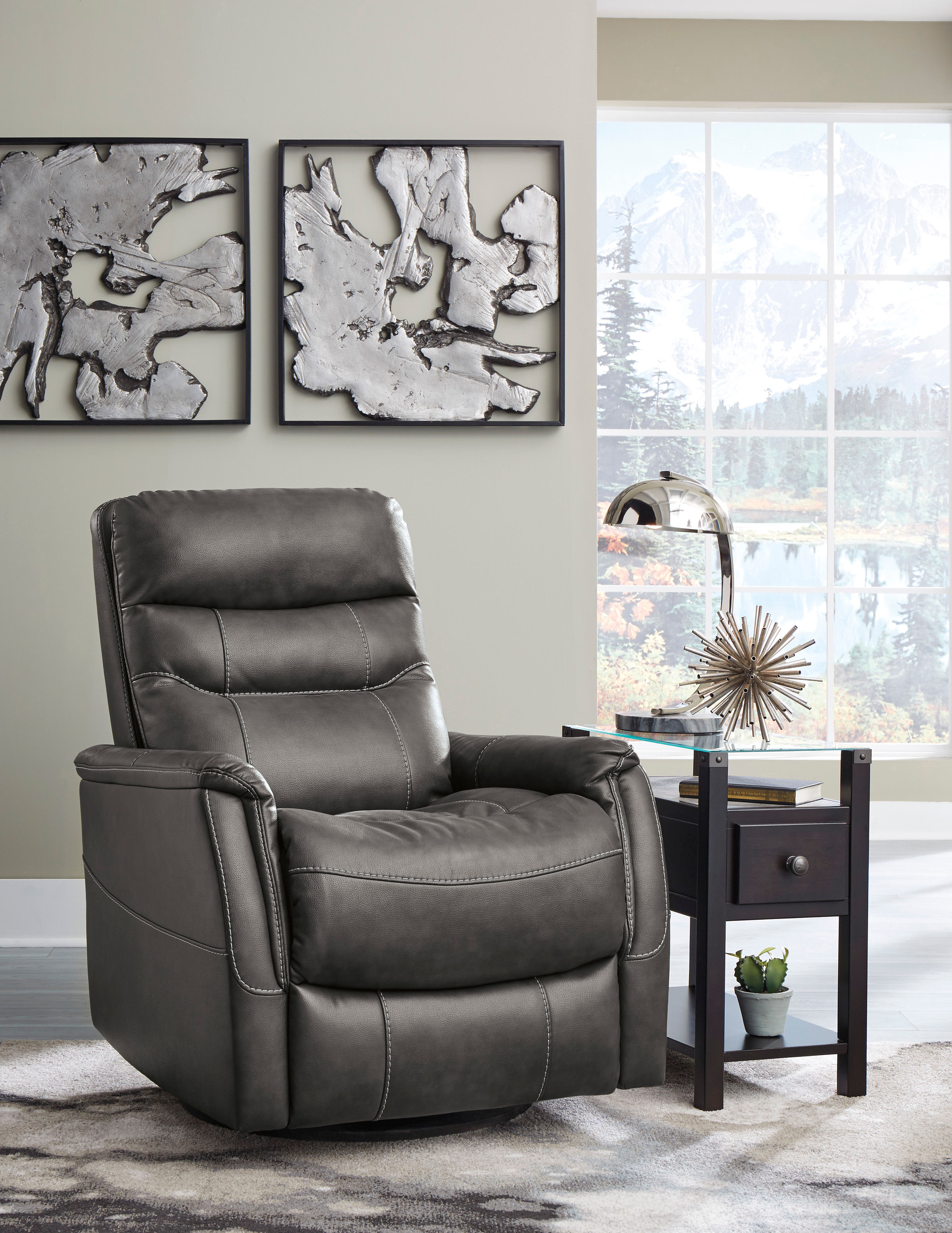 The gray Riptyme swivel glider recliner has a stylish, space-conscious design with indulgent comfort.