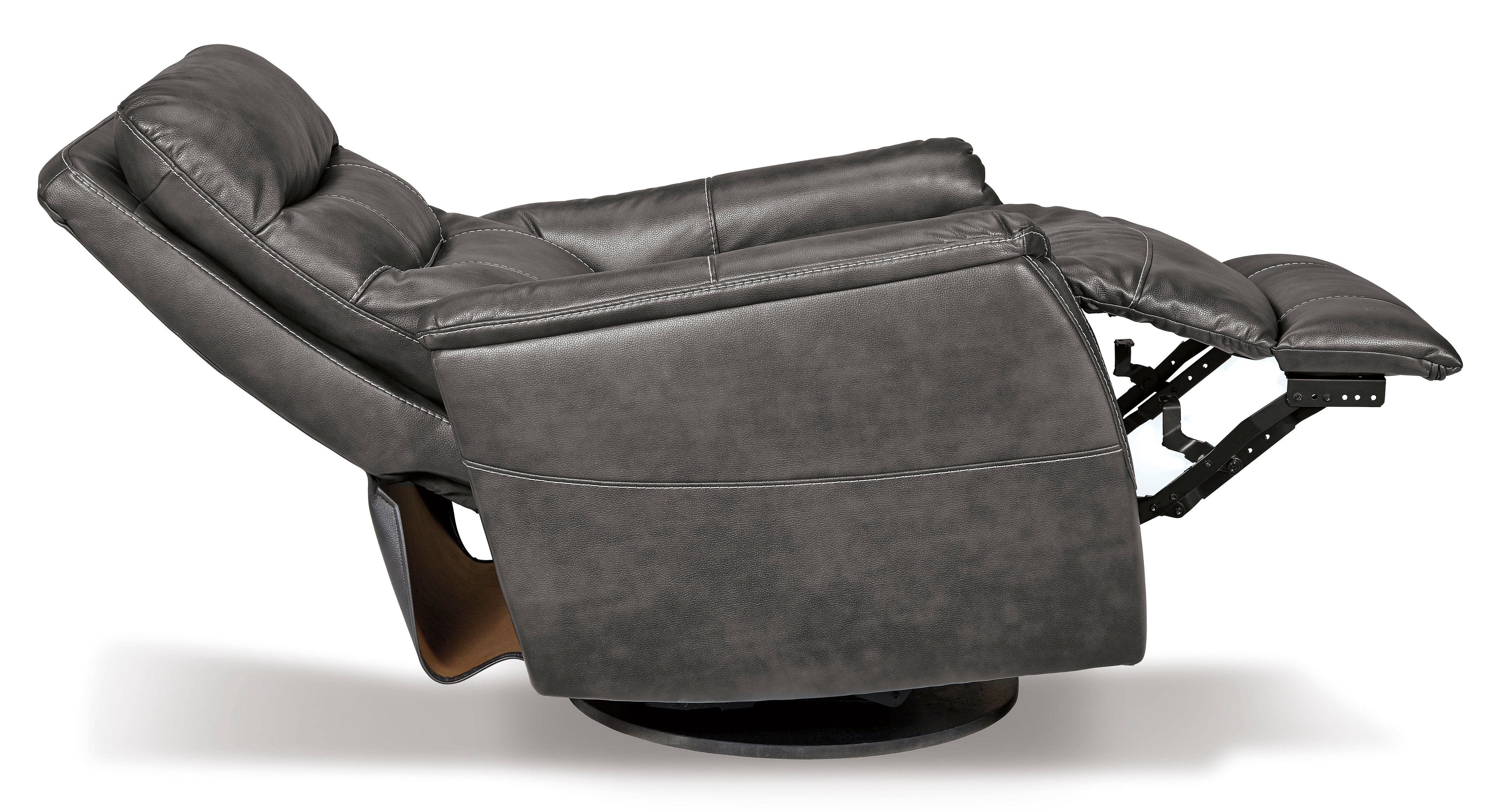 If you agree it’s high time for better form and function from your furniture, the Riptyme swivel glider recliner with gentle rocking motion might be just your style. Indulgently comfortable yet anything but bulky, its space-conscious design pairs slimmed-down armrests with a roomy seating zone for maximum comfort. Rest assured, the sumptuously cushioned 41" high back is head and shoulders above the rest. Thanks to an EZ Pull tucked discreetly inside the armrest, while this faux leather chair may be a recliner, it sure doesn’t look like one.