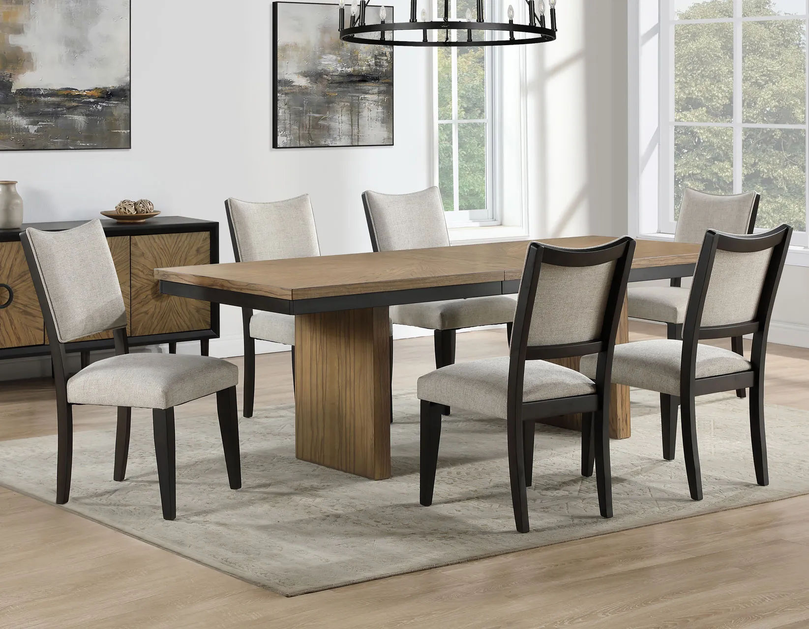 The Roatan 80-96 inch Table with a self-storing 16-inch leaf combines modern design with functionality, making it a standout piece for any dining area. This double pedestal table easily seats ten, offering a perfect solution for both intimate family dinners and large gatherings. Its sturdy base and stylish support enhance the room’s aesthetic while providing reliable durability. The light toffee finish and reverse-matched diamond veneer highlight the natural beauty of the wood, adding warmth and sophistication to your décor. Crafted from limba veneers, solid Asian hardwoods, and engineered woods, this table features a streamlined, elegant look with a two-tone toffee and black finish. The table extends effortlessly with a high-quality steel glide and stores the leaf conveniently underneath.