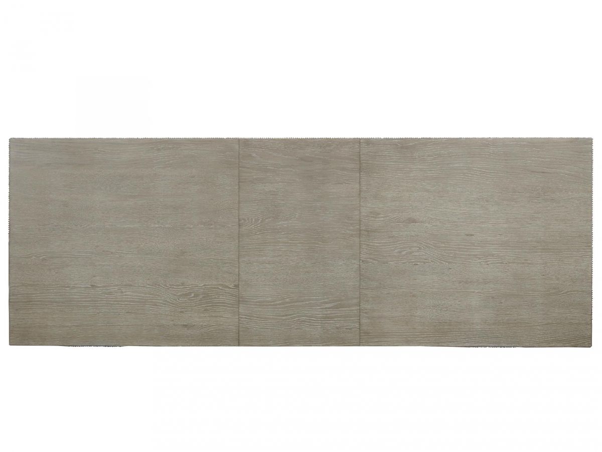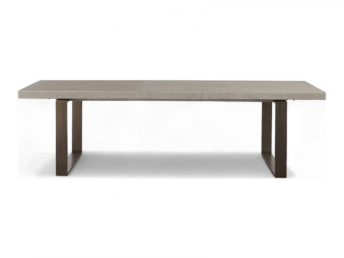 The Robards Rectangular Dining Table artfully juxtaposes a lustrous bronze base against a delicately ridged, matte-finished wood, creating a bold dining room statement piece.