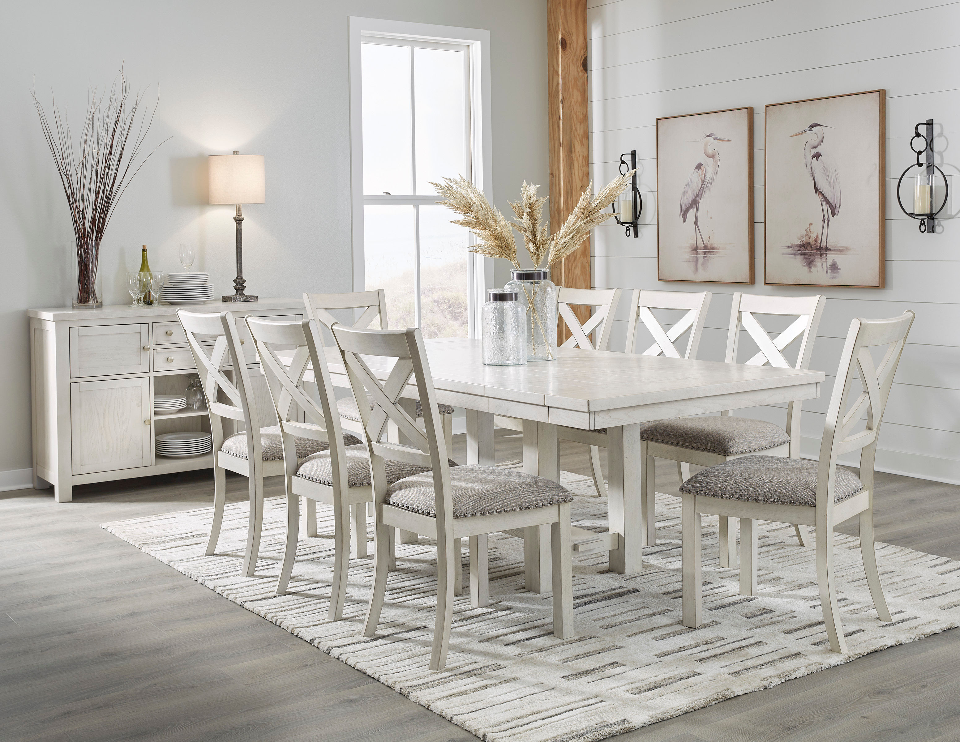 This dining package is sure to impress come mealtime. With its antiqued white finish and a planked effect tabletop, farmhouse-style dining has never been so fashionable. All that’s missing is you and your family.
