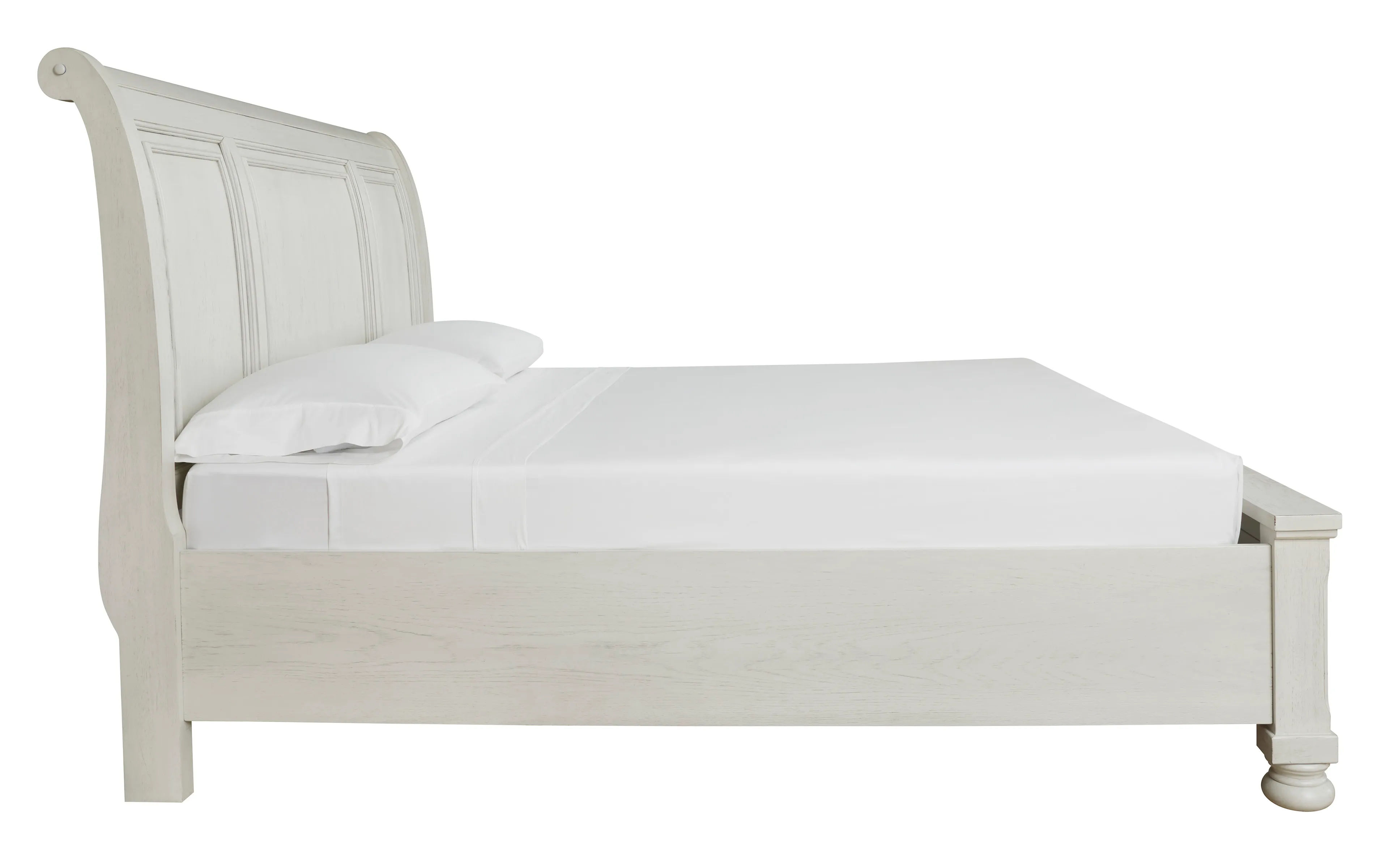 Elegant, timeless furnishings take your bedroom to the next level. Nothing does that better than the Robbinsdale queen sleigh bed with storage footboard. The antiqued white finish with a wonderful grain texture radiates sophistication, while the dark bronze-tone hardware adds an ornate touch. Rounding things out, the subtle curve of the headboard keeps the look polished and poised.