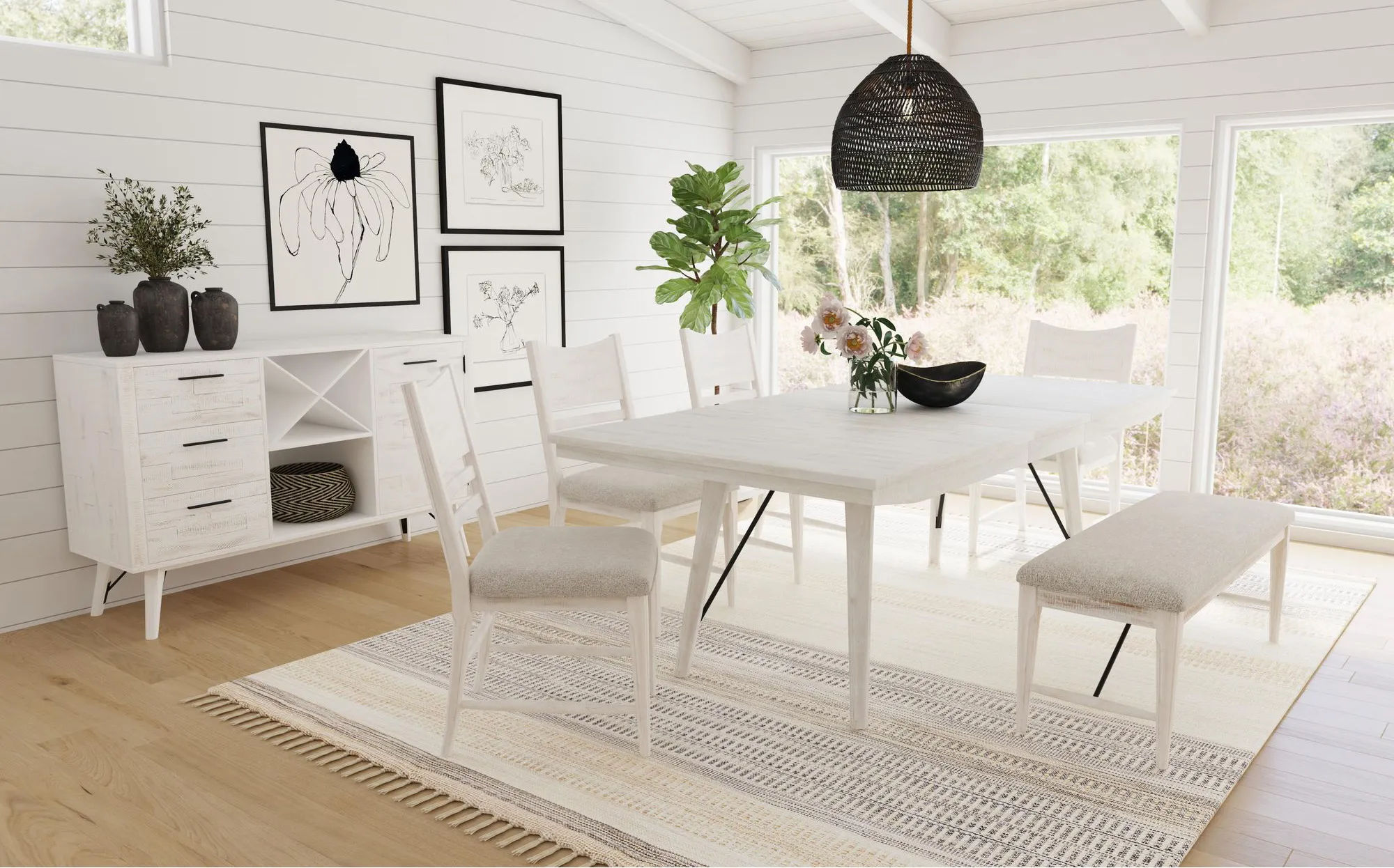 Embrace the modern farmhouse style of the Rogen Dining Bench in a distressed white finish.