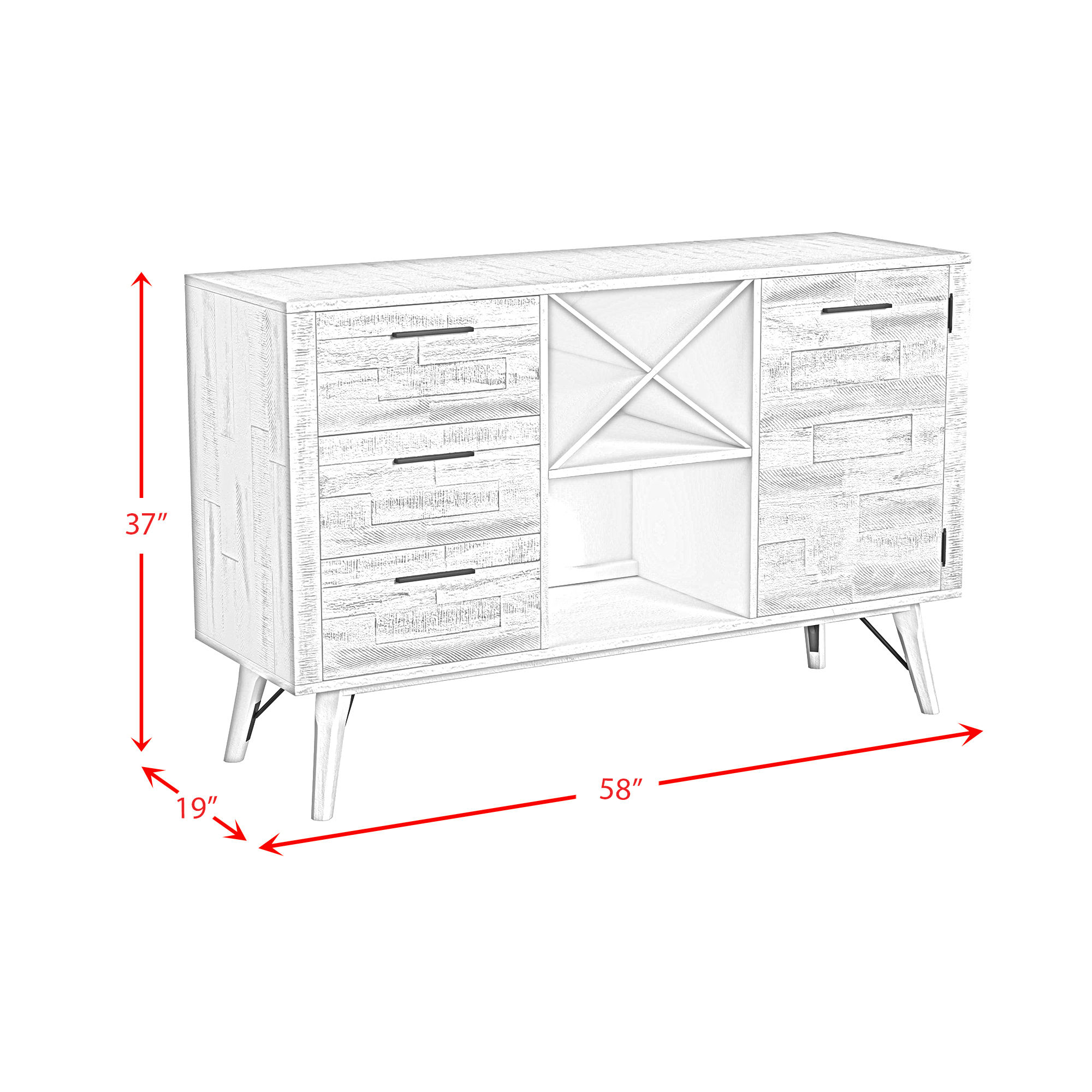 The distressed white finish on the Rogen Server will add a modern farmhouse style to your dining area. The contrasting black metal hardware creates more visual interest and the different drawers will provide ample storage space for your dining essentials. The wine rack on the top middle shelf is able to hold up to 4 wine bottles.