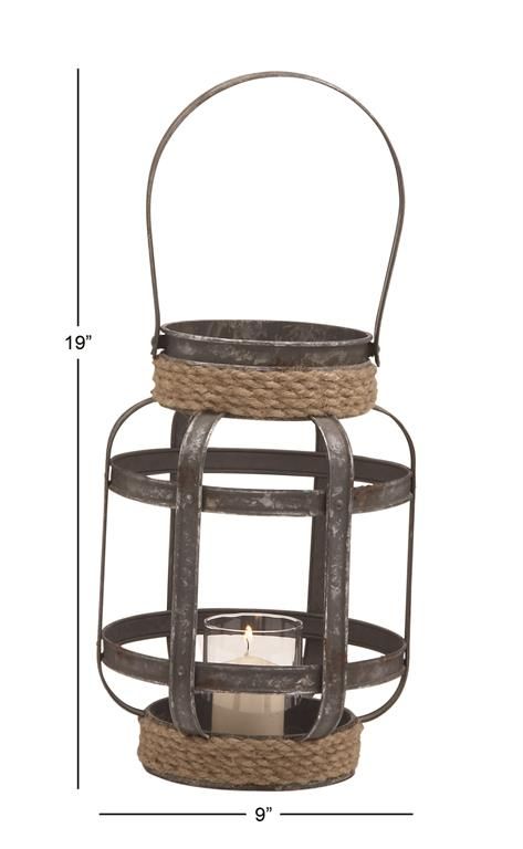 Features an industrial inspired design with clean lines and a structural appeal. Lantern candle holder is made of a solid iron and glass construction for durability. Comes in a rustic gray finish with brown rope. Features a decorative and vintage look with a large metal open housing cage, retro design rope handle and a hurricane glass body.