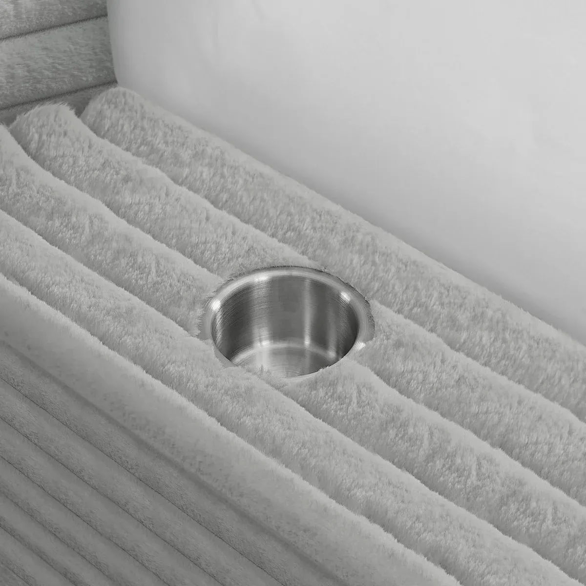 Introducing the Rosebery king upholstered low-profile bed, this bed is the epitome of true cozy comfort. Made with a light gray corduroy upholstered all around this queen bed and the two matching pillows that are included, you'll be able to wind down in style. The cupholders on the sides of the bed will keep your drink nearby and make this the perfect place to curl up and read a book or watch your favorite shows.