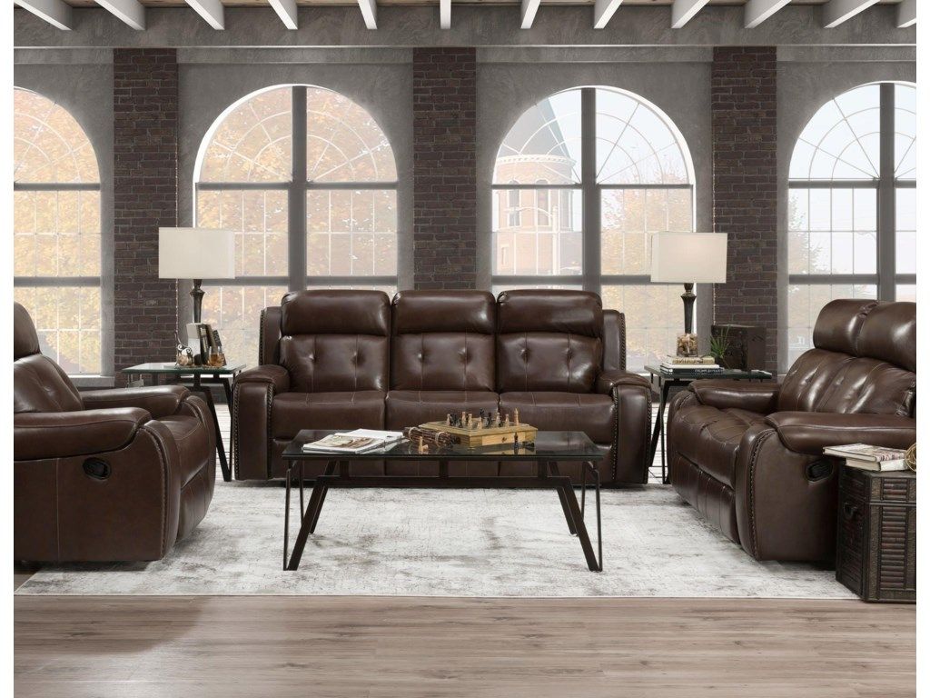 Made with dark brown leather upholstery, the Rosewood Reclining Loveseat has an industrial style that will bring an eye-catching look to your living room. The nailhead trim adds a sophisticated charm and the plush cushioning adds a luxurious comfort. The neutral color palette will help this reclining loveseat blend in with your existing decor while adding a timeless elegance.