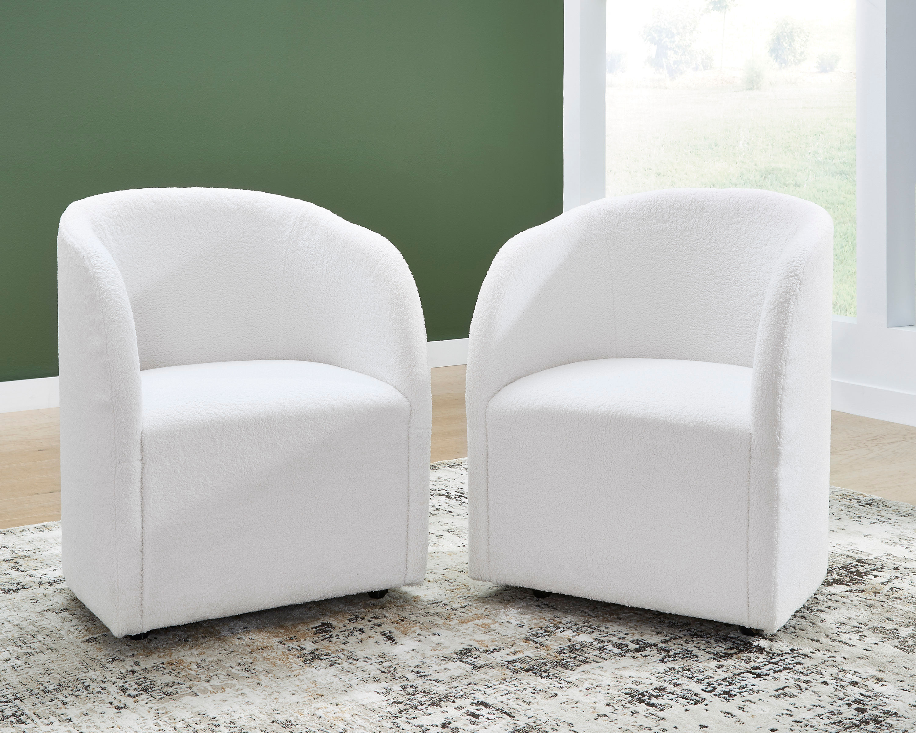 Inspired by art deco design, this fully upholstered dining chair makes a lasting impression in a simply stunning way. Its magnificent curved silhouette is enhanced with a neutral boucle upholstery that’s so pleasing to the palate. This is the piece you’ve been looking for to elevate your contemporary decor whether you’re dining, listening to your latest playlist or binge-watching with friends. Plus, it’s set on casters so it’s easy to move around.