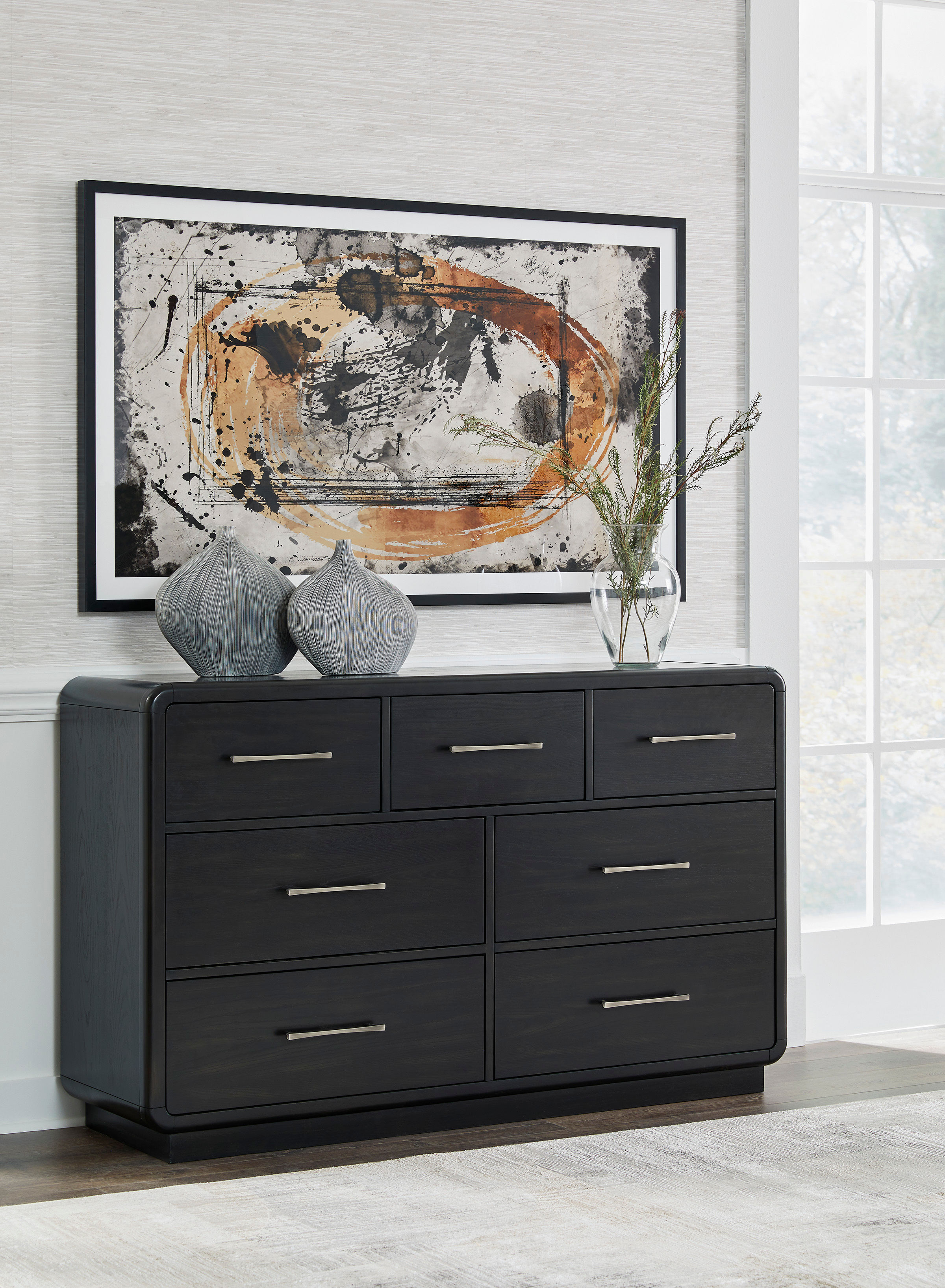 Inspired by art deco design, the softly shaped Rowanbeck dresser makes a lasting impression in a simply stunning way. Its magnificent curved silhouette is enhanced by a rich layered black finish on the textured wood grain surface. This is the statement piece you’ve been dreaming of to elevate your contemporary inner sanctum.