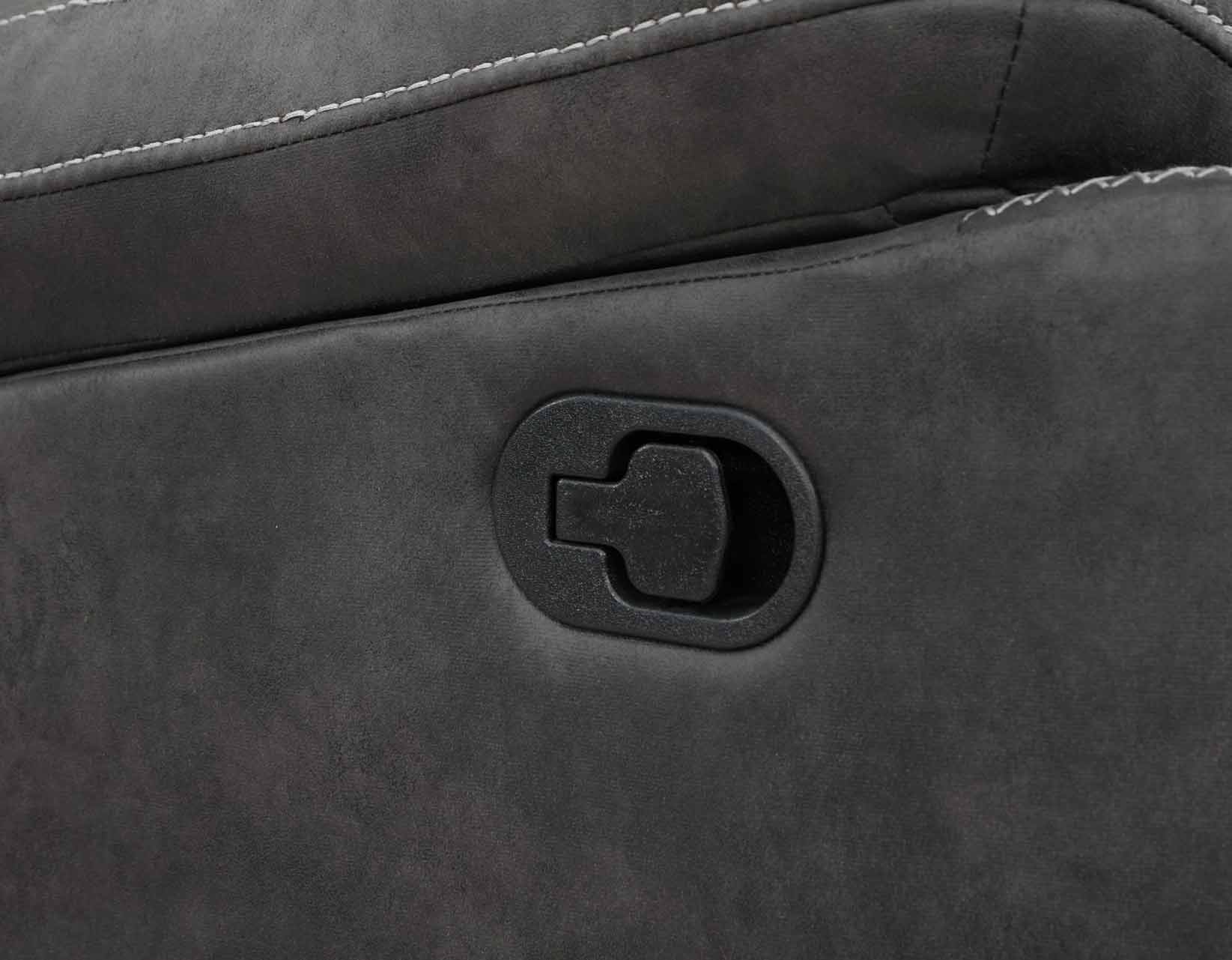 Introducing the dark gray Rudger manual recliner – the ultimate in comfort and style. Its bomber jacket-like microsuede cover with contrasting baseball stitch and clean lines exude a rugged yet refined charm. The deeply padded seat and bustle back, with fiber-wrapped foam and pocket coil construction, offer extra padding where you need it. With an effortless pull of the lever, slip into relaxation mode and enjoy your favorite book or movie in divine comfort. The unique combination of style and comfort make this recliner the perfect addition to any room seeking both. Experience the ultimate in relaxation and style, order your dark gray Rudger manual recliner today!