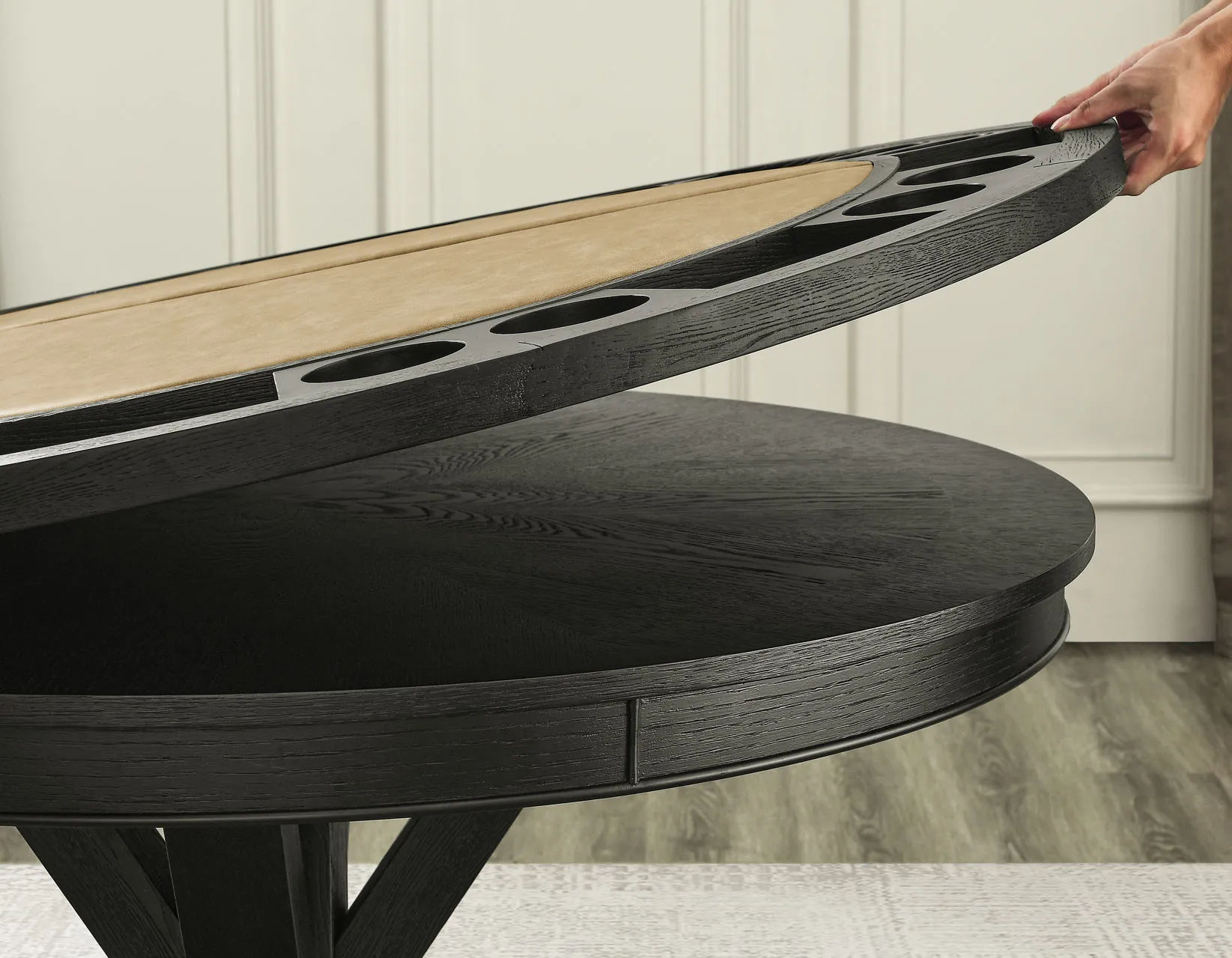 • Folding Game Top sits on top of the  48-inch round Rylie table for game night and then can be removed and stored in the included carry bag to use the table for dining