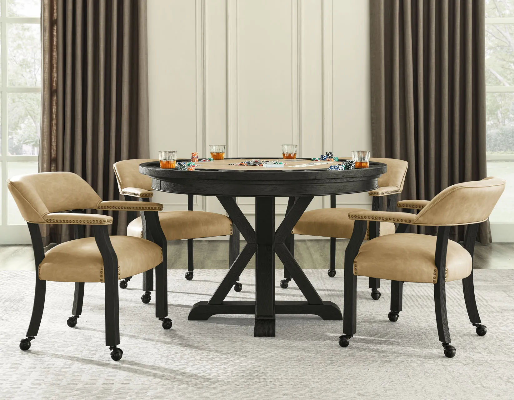 Get ready for game night with the Rylie Black Finish 6-Piece Game Dining Set! This cool set includes a 48-inch round table with a folding game top and four super comfy castered Captain’s chairs in sand vegan leather, jazzed up with copper nailhead trim. The folding game top is a blast, offering eight stations with dual cupholders and chip holders. When the games are done, just remove the top, tuck it away in its carry case, and you’ve got a sleek dining table ready for four. The set’s glossy black finish gives it a modern edge, perfect for any room. Each piece is crafted from oak veneers, poplar, and Asian hardwoods, all kiln-dried to avoid any warping or mildew issues. The pinwheel oak veneer pattern on the table adds a touch of elegance, making it great for dining or working. And those chairs? They’re not just stylish but also super practical with their full rotation and solid wood legs for durability. The best part? Easy assembly, with all tools included.