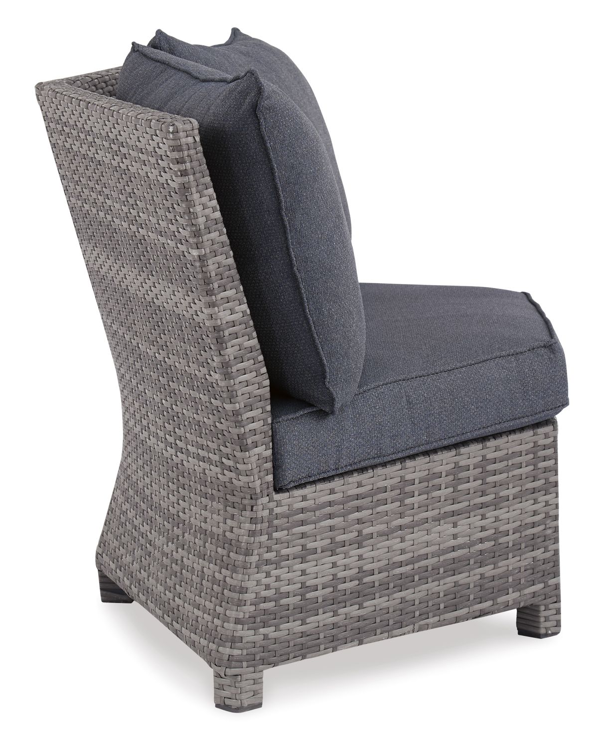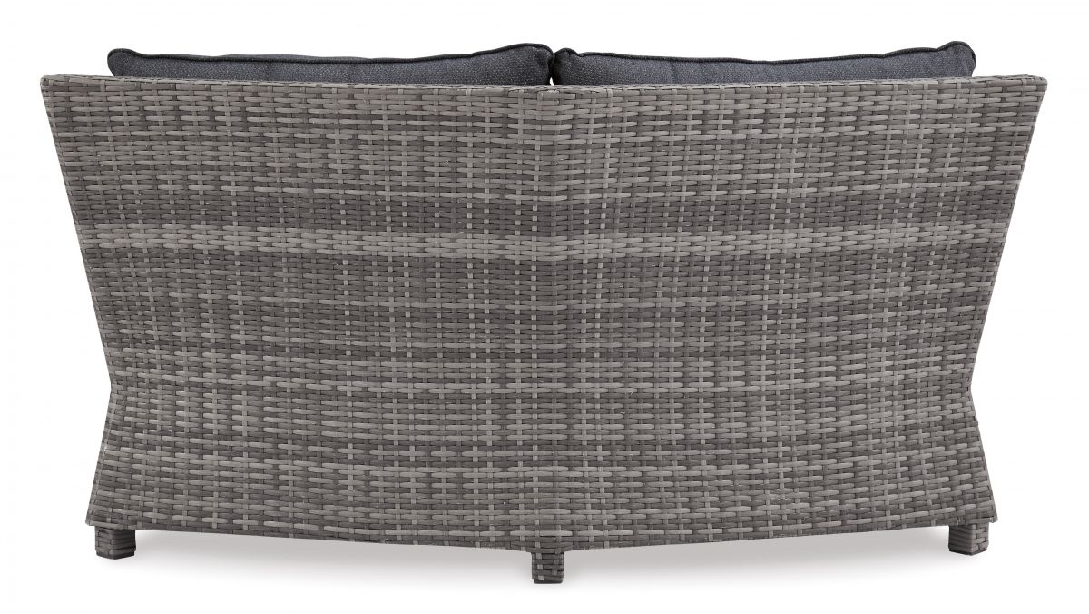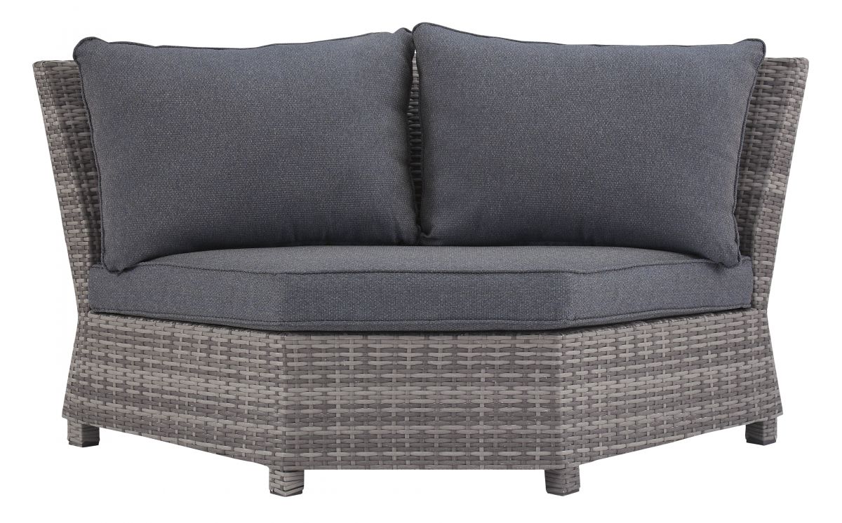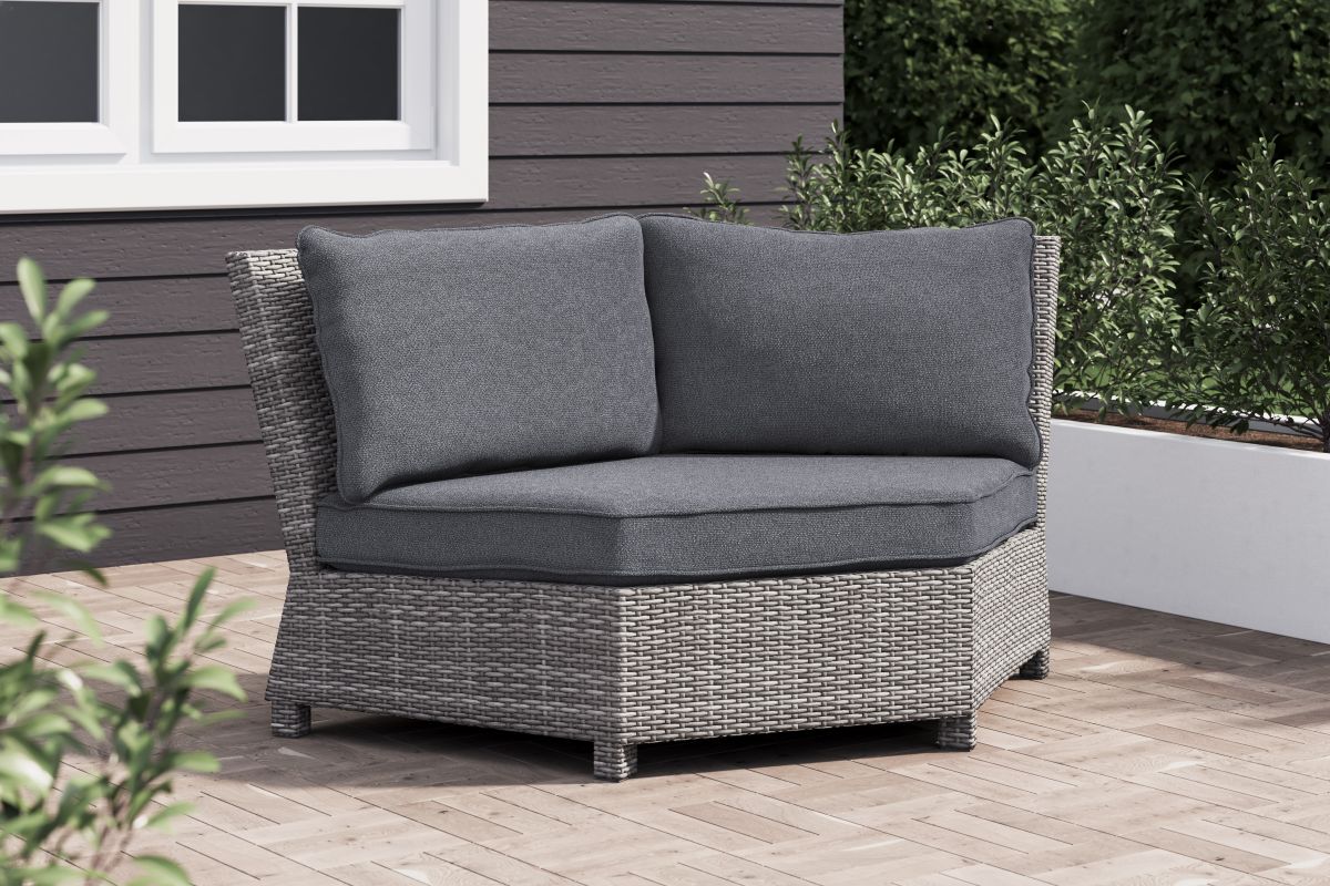 Bring a coastal cool vibe to your outdoor living space with this cushioned corner seat. What looks like rattan is actually handwoven resin wicker in gray with all-weather protection. Rest assured, the gorgeous blue-gray cushions are covered in Nuvella® fabric that weathers the elements and is a breeze to clean. Concealed frame is powder coated for seasons of carefree use.