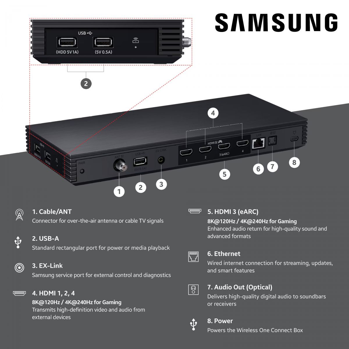 • Wireless One Connect: Say goodbye to cluttered cables around your TV. Plug the HDMI cables from your devices like your set top box, gaming console, and soundbar into the Wireless One Connect box, which transmits the signal to the TV wirelessly. You can place it up to 30 feet from the TV, giving you more freedom to keep your devices out of sight and elevate your interior design.