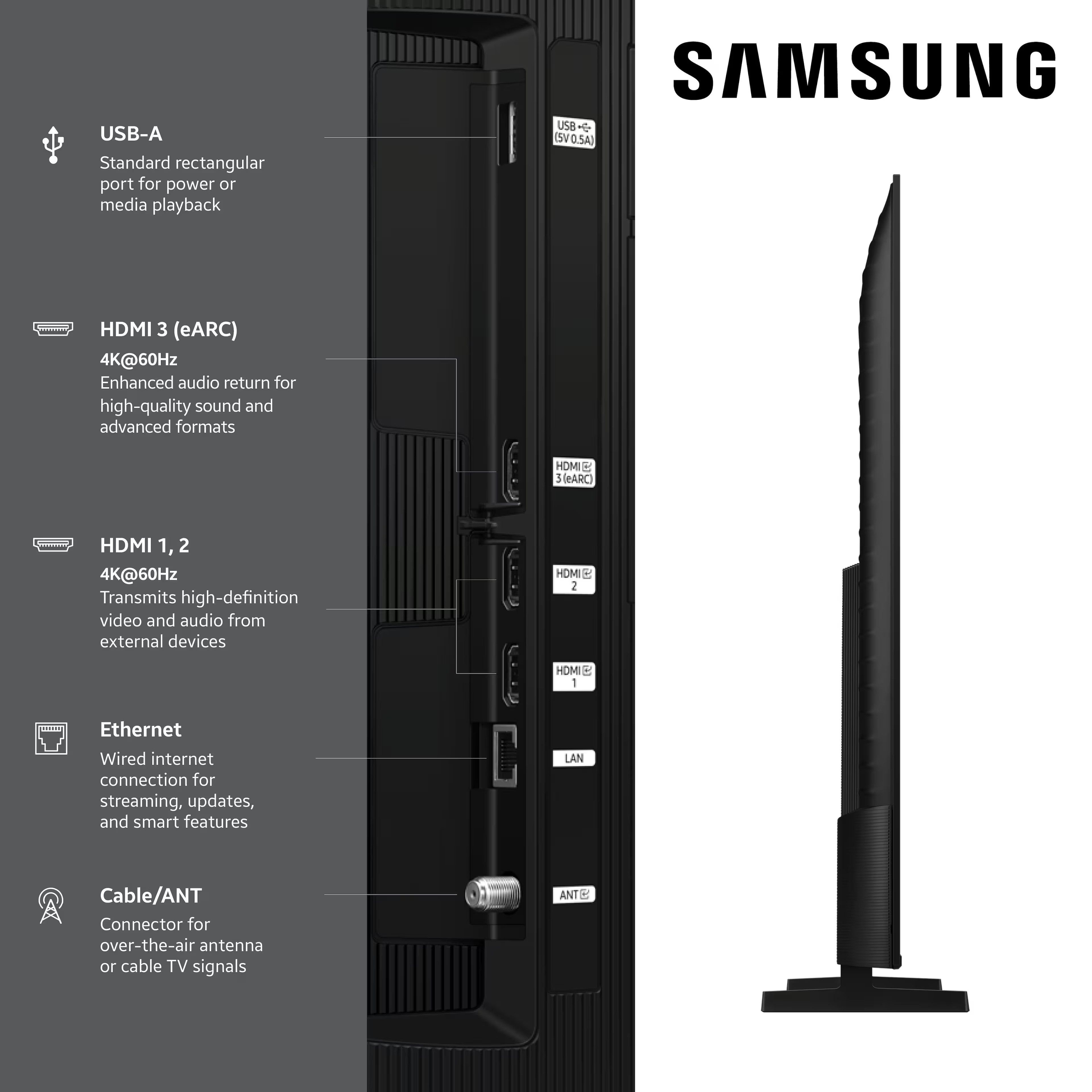 • Q-Symphony: Unlock more robust, nuanced sound when your Samsung TV and soundbar speakers work together as one. Most soundbars mute the TV speakers when activated. Why choose between your TV and soundbar to play sound, when you can have them both work together? Enjoy optimized surround sound, hear clear dialogue, and dive into a cinematic sound experience.