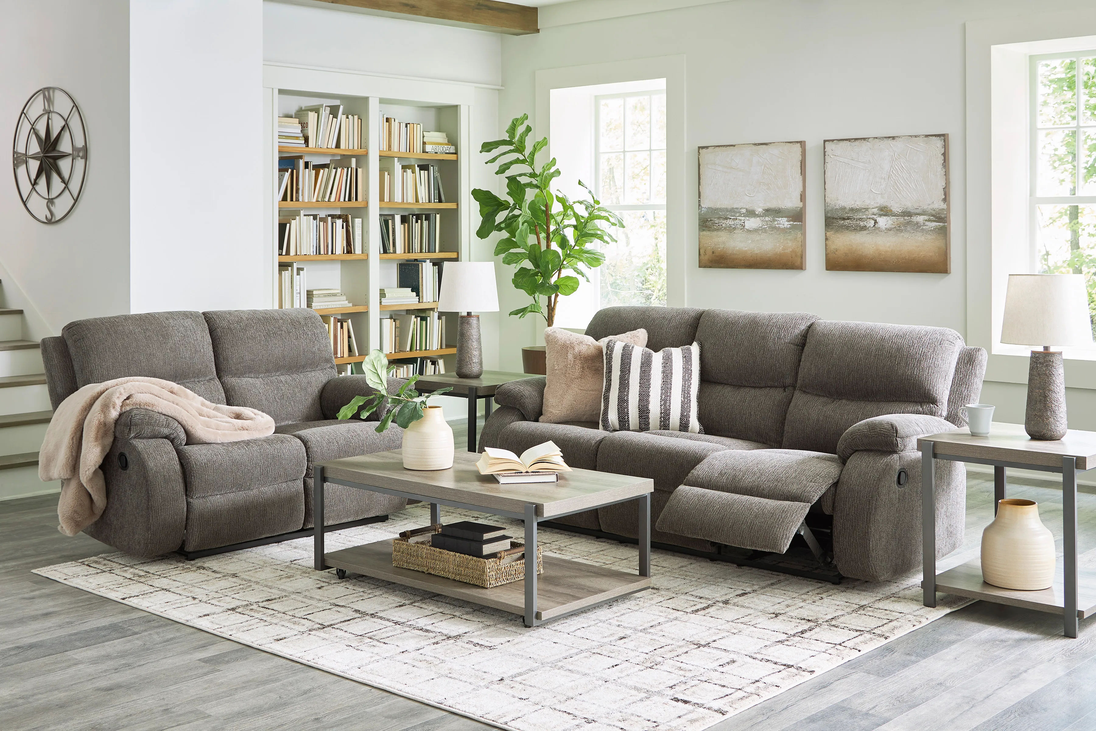 Relax and recharge with the gray Scranto reclining set– simple, contemporary, and stylish comfort.
