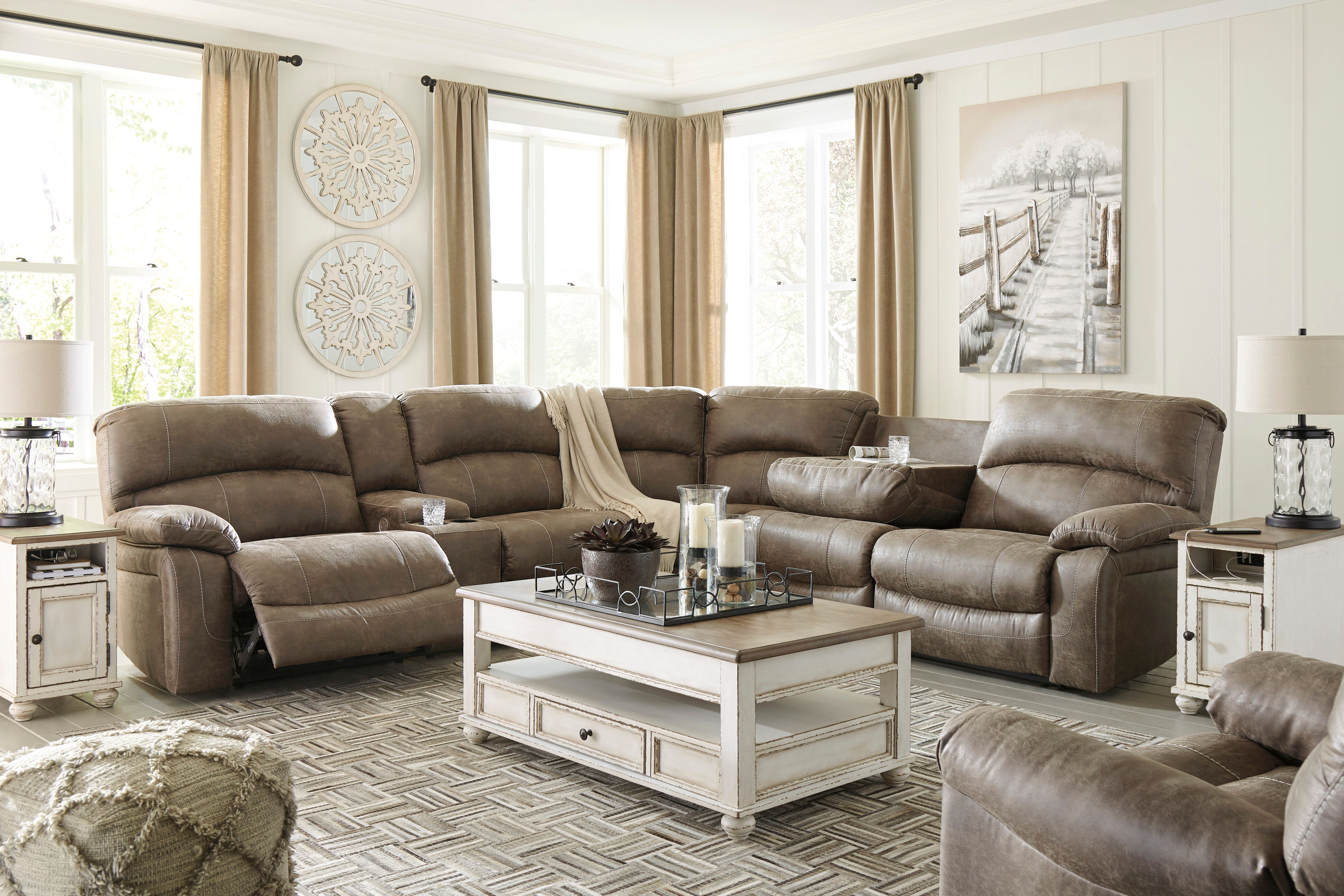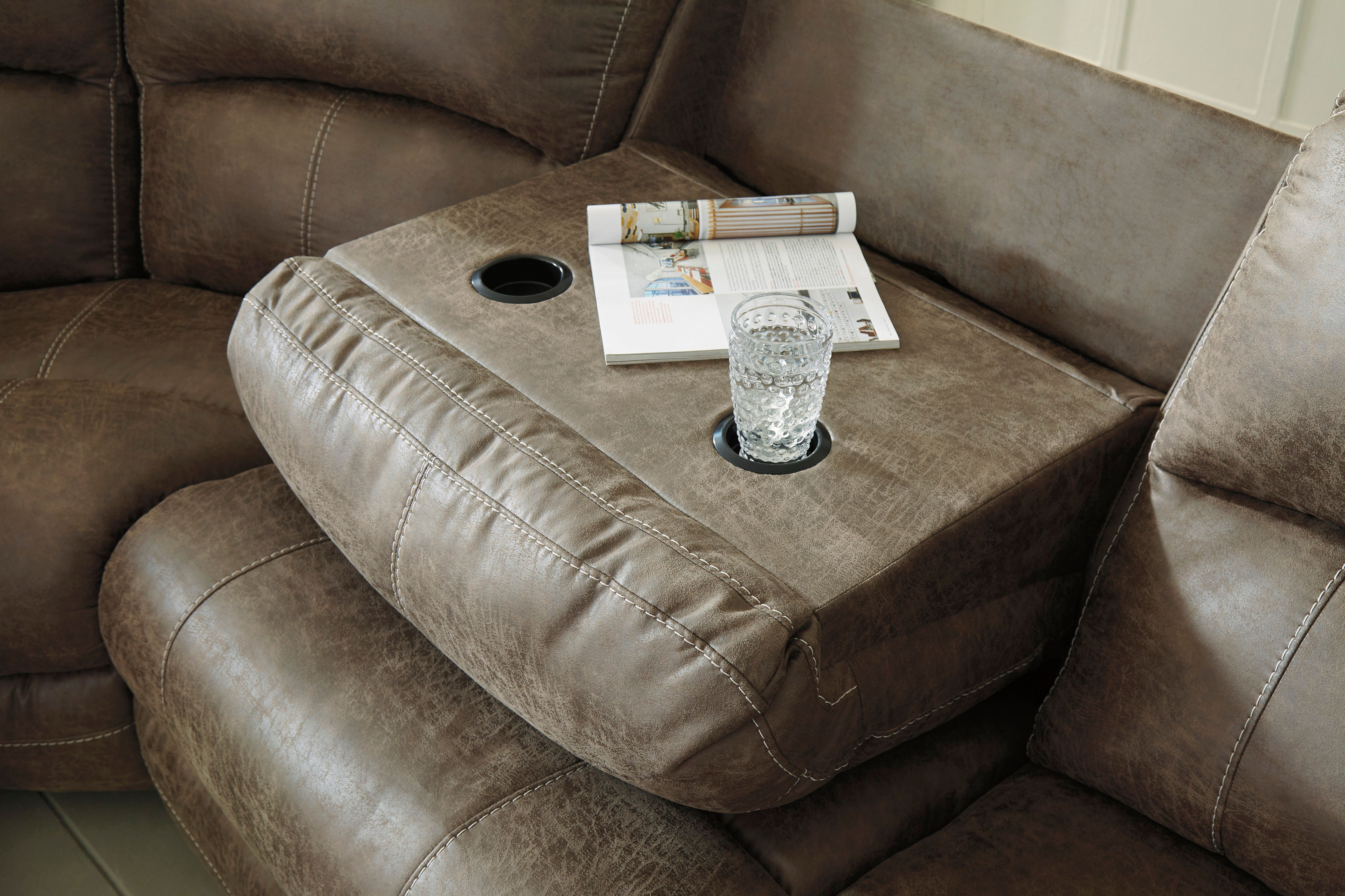 Sporting a driftwood brown faux leather with a gently distressed sense of charm, this sectional invites you to drift away in high style. Rest assured, the sectional’s leather alternative upholstery offers a warm, cozy feel, while clean-lined styling and jumbo stitching deliver the cool, contemporary look you love. Factor in a power reclining motion, USB charging, convenient cup holders and a drop-down table, and you’ve got all the makings for the best seats in the house.