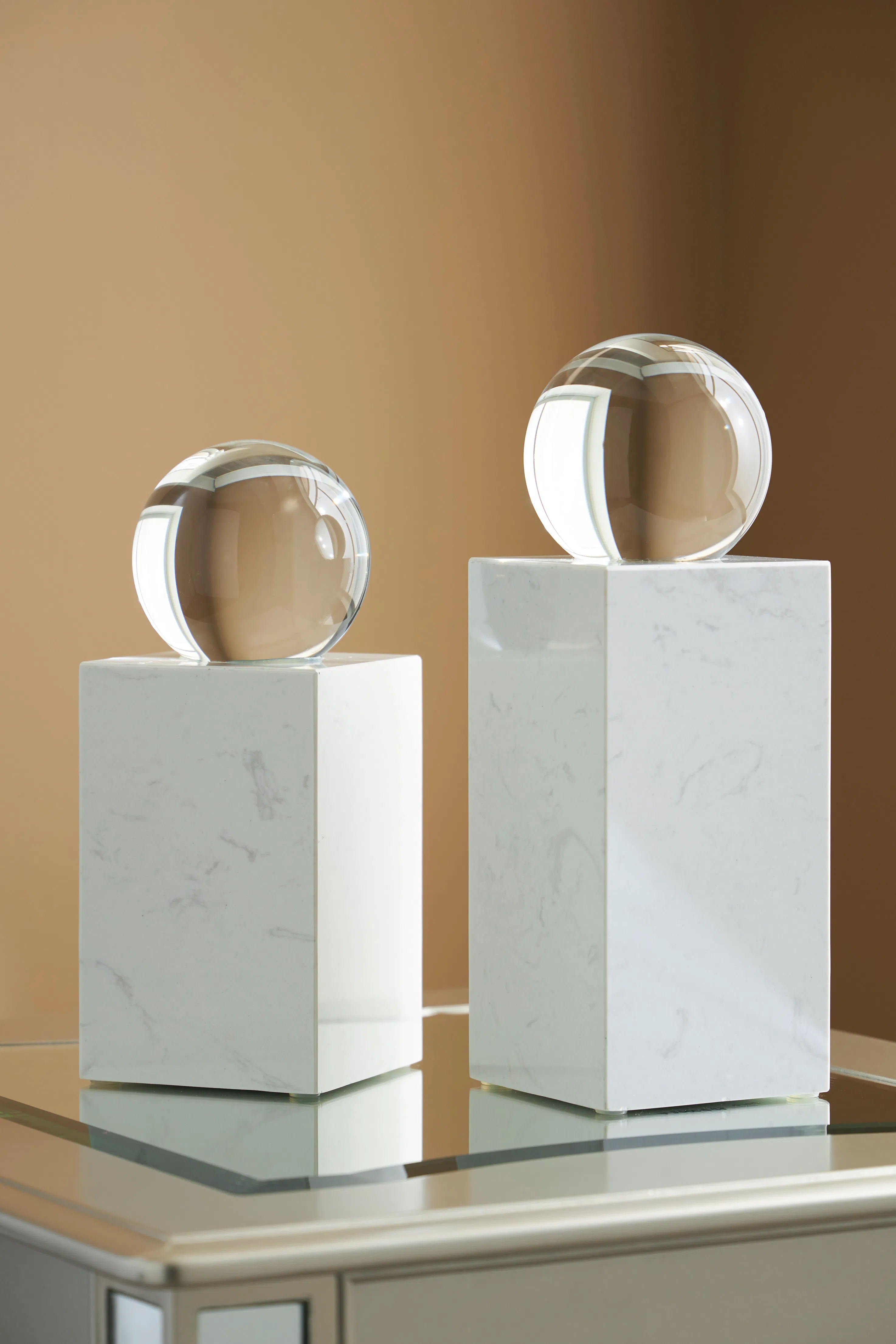 Elevate your home decor with a new accent piece, like the Sellner sculpture. This sculpture features white marble and a round clear crystal on the top, enhancing the contemporary style. Due to the use of natural materials, some variations may occur.