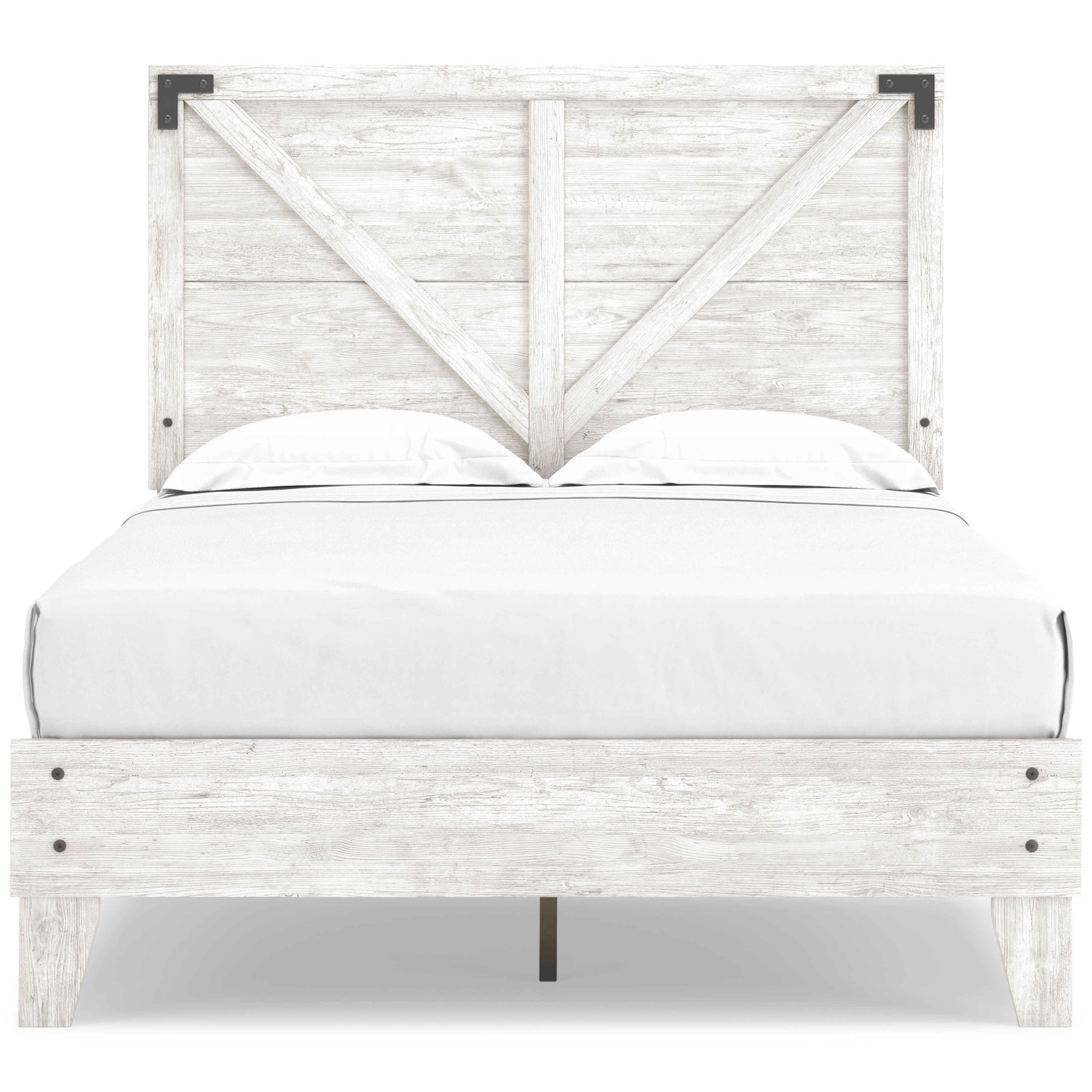 Give provincial a new meaning with the chic look of the Shawburn full crossbuck panel platform bed. The worn whitewash distressed finish keeps this piece light and fresh while the warm pewter-tone hardware adds an industrial touch. The panel headboard with crossbuck detail adds a delightfully homespun charm to your space. Best of all, our innovative bed-in-a-box shipping system delivers your new bed right to the door.