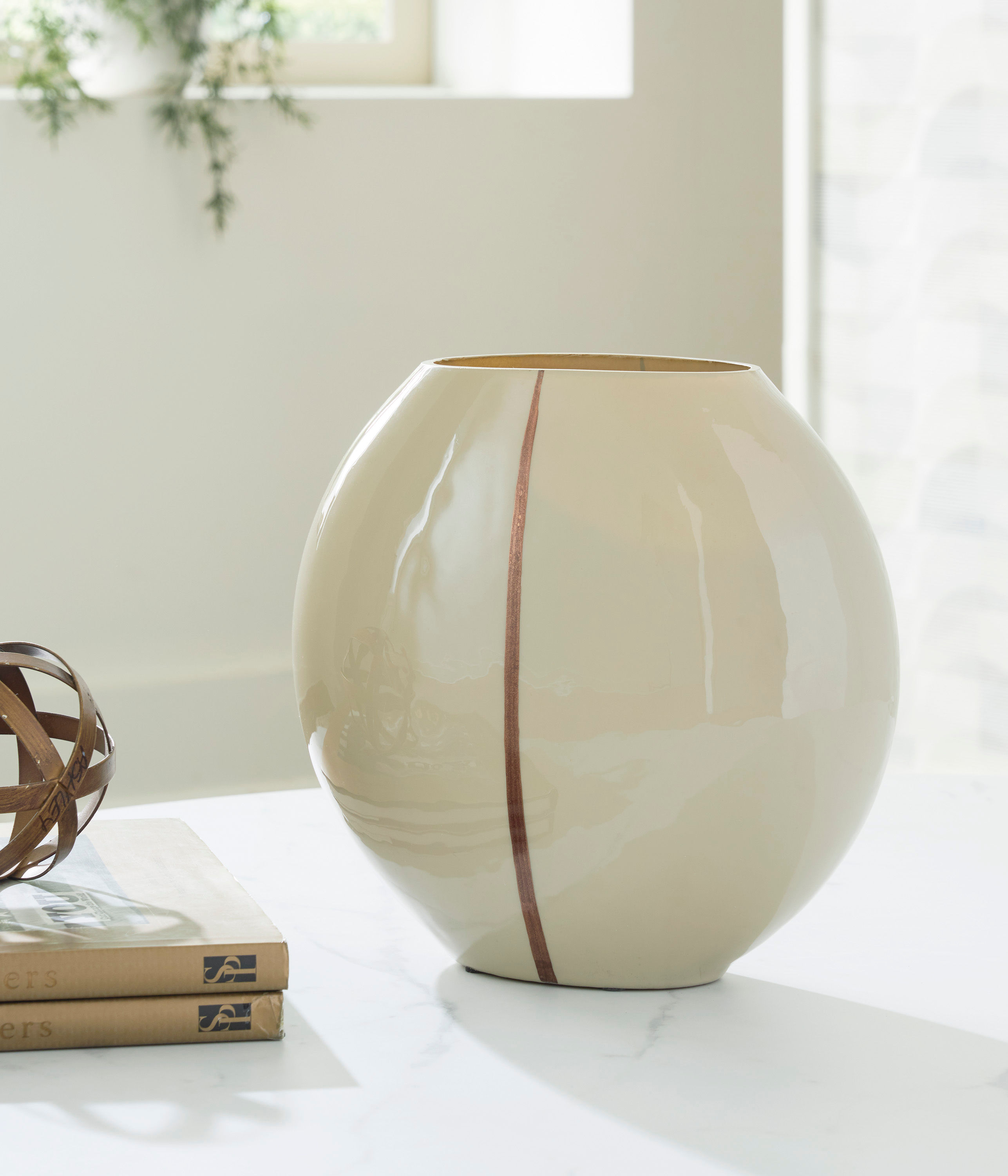 Create a contemporary vibe for your coffee table, shelf or foyer with the Sheabourne vase. An eye-catching metallic accent showcases its softly rounded shape, bringing a modern flair to the otherwise timeless form. The vase serves as a sculptural accent on its own, and it's equally as exquisite when holding your favorite decorative florals.