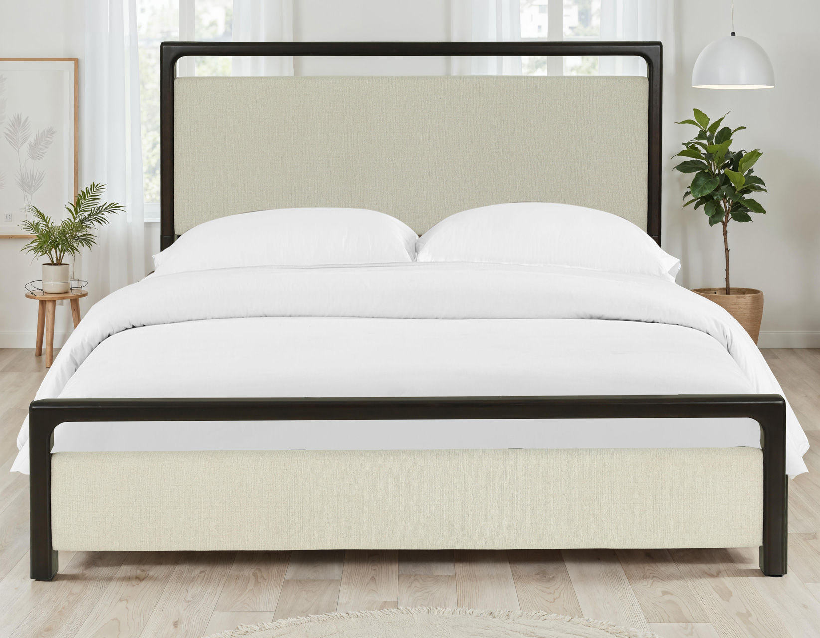 The Sigmund King Bed blends modern rustic styling with exceptional comfort. Crafted from solid Asian hardwoods, oak veneers, and engineered woods, it features a rich sable stain paired with a cream polyester-upholstered headboard insert—creating a cozy spot for reading or watching TV. Softly rounded corners, smooth edges, and the signature Sigmund open-space design complete the look, bringing warmth and contemporary character to any bedroom.