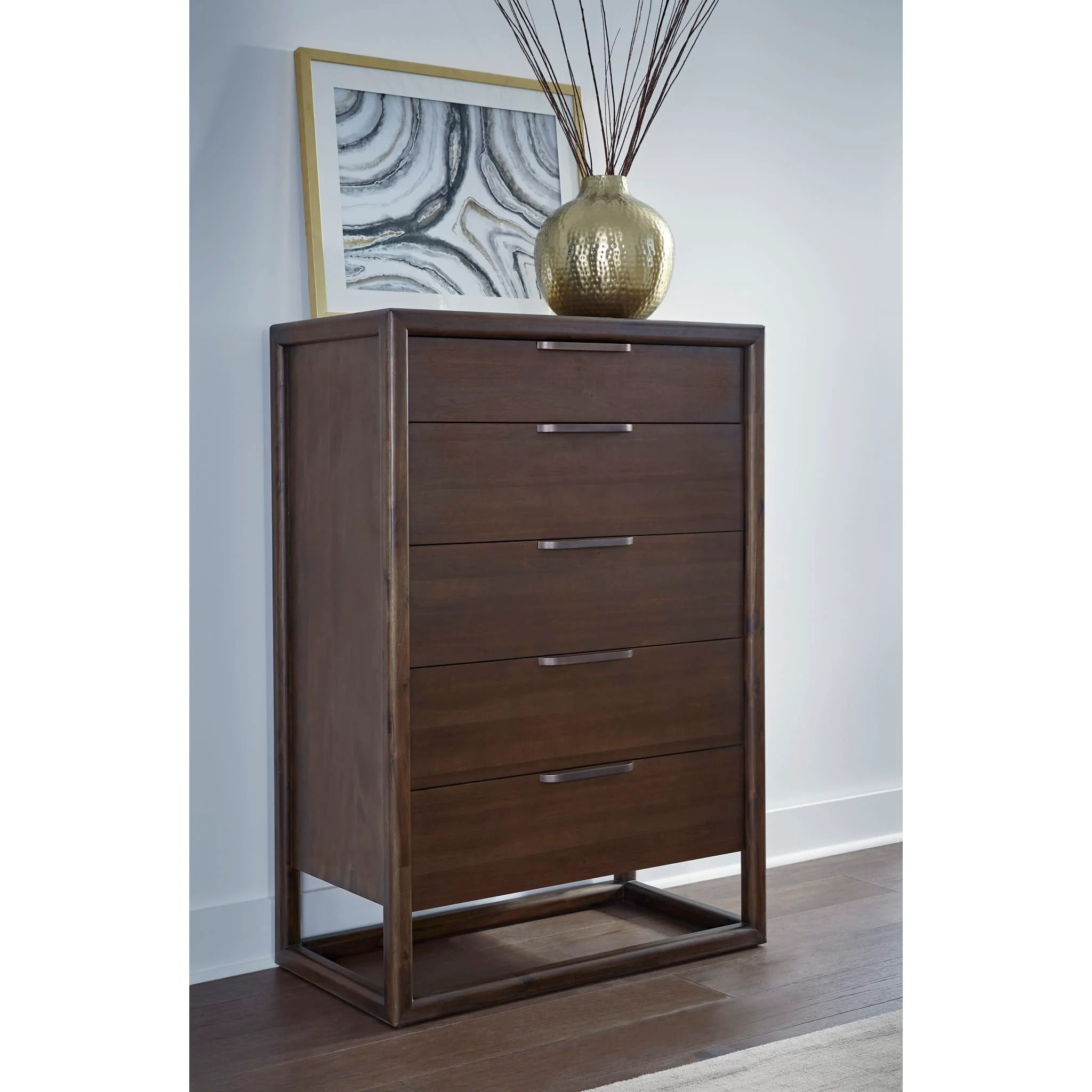 A modern design, the Sol 5-drawer chest of drawers features a rich brown stain and low sheen lacquer.