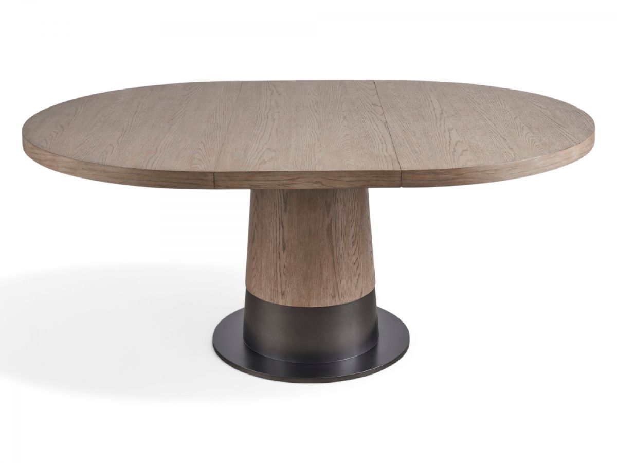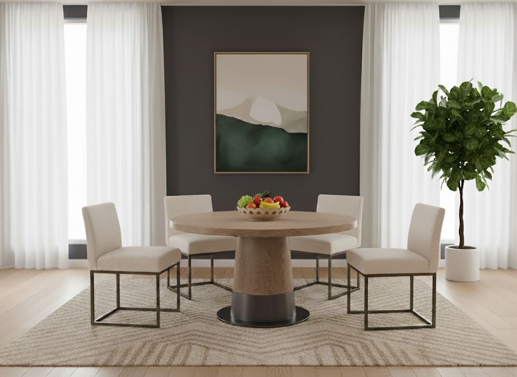 The Solara Dining Table showcases an intriguing two-tone aesthetic, blending the warmth of a Gray Oak finish with the cool, aged character of a Satin Pewter metal base. This rounded table harmoniously combines textures and hues, infusing spaces with a cool, dynamic vibe and a nod to mid-century design sensibilities.