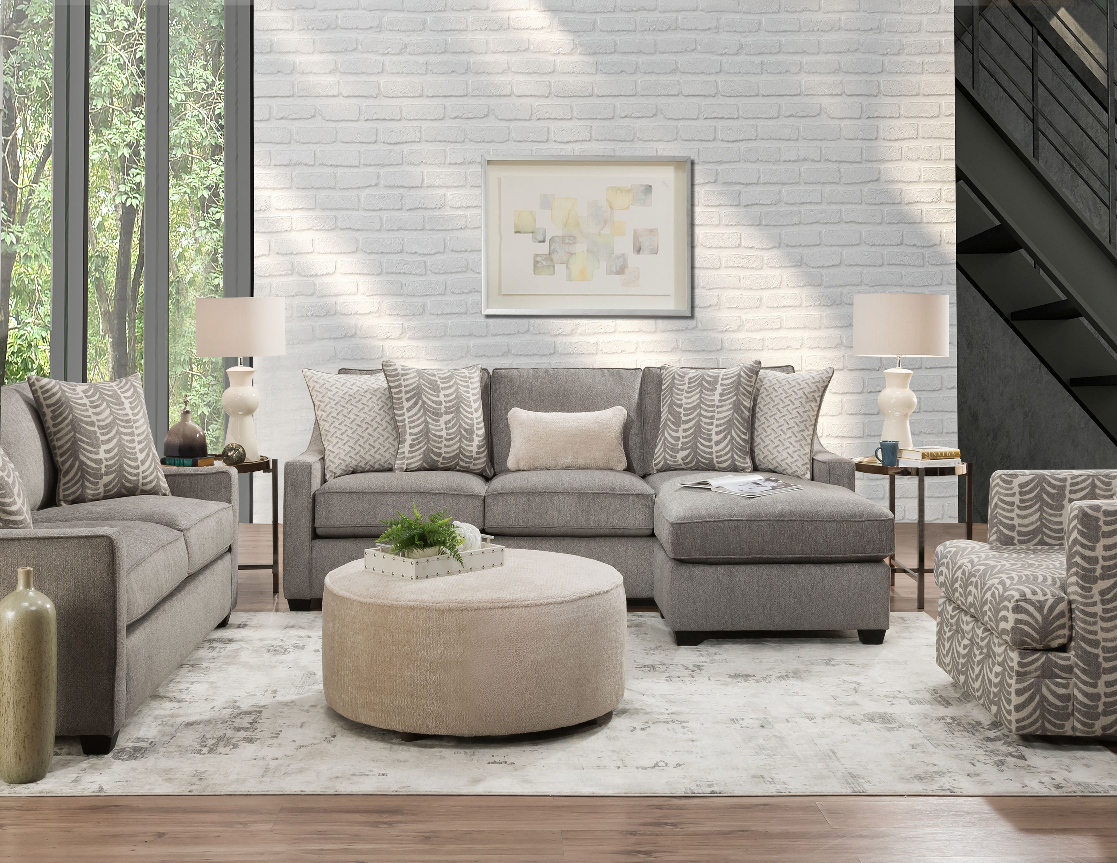 The comfortable St. Charles sofa chaise features a neutral color palette and fabric upholstery.